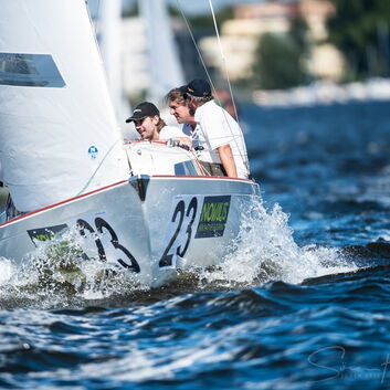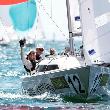 After nine of twelve races, there is an exciting duel at the top. The 🇩🇰 DEN 597 with Claus Høy Jensen at the tiller and the 🇮🇹 ITA 555 with Flavio Favini are fighting for the World Championship title in a thrilling race. Both are currently separated by 4 points.