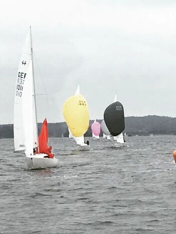 Nach vielen heißen Wochen waren Regen und Gewitter angesagt. Alle waren gespannt, wie denn die Bedingungen sein würden, die laut Vorhersage zunächst viel Regen, aber kaum Wind bringen sollten. Doch wir wurden positiv überrascht: Sowohl das Wetter als auch der Wind waren ordentlich. Bei 2-3 Bft konnten am Samstag drei und am Sonntag zwei Wettfahrten gesegelt werden. Jede Wettfahrt ein Genuß!
