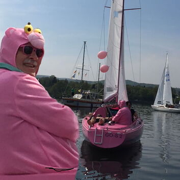 Letztes Jahr kam Dirk Stadler als Pink Panther verkleidet zum Edersee, um den "Pink Panther" von Stefanie Waldeck (ESV'86) zu steuern. Doch dieses Jahr ist Westdeutsche Meisterschaft und Dirk kommt mit seinem eigenen Schiff. #hboat #hboot #sailing #segeln #aufdemwasser
