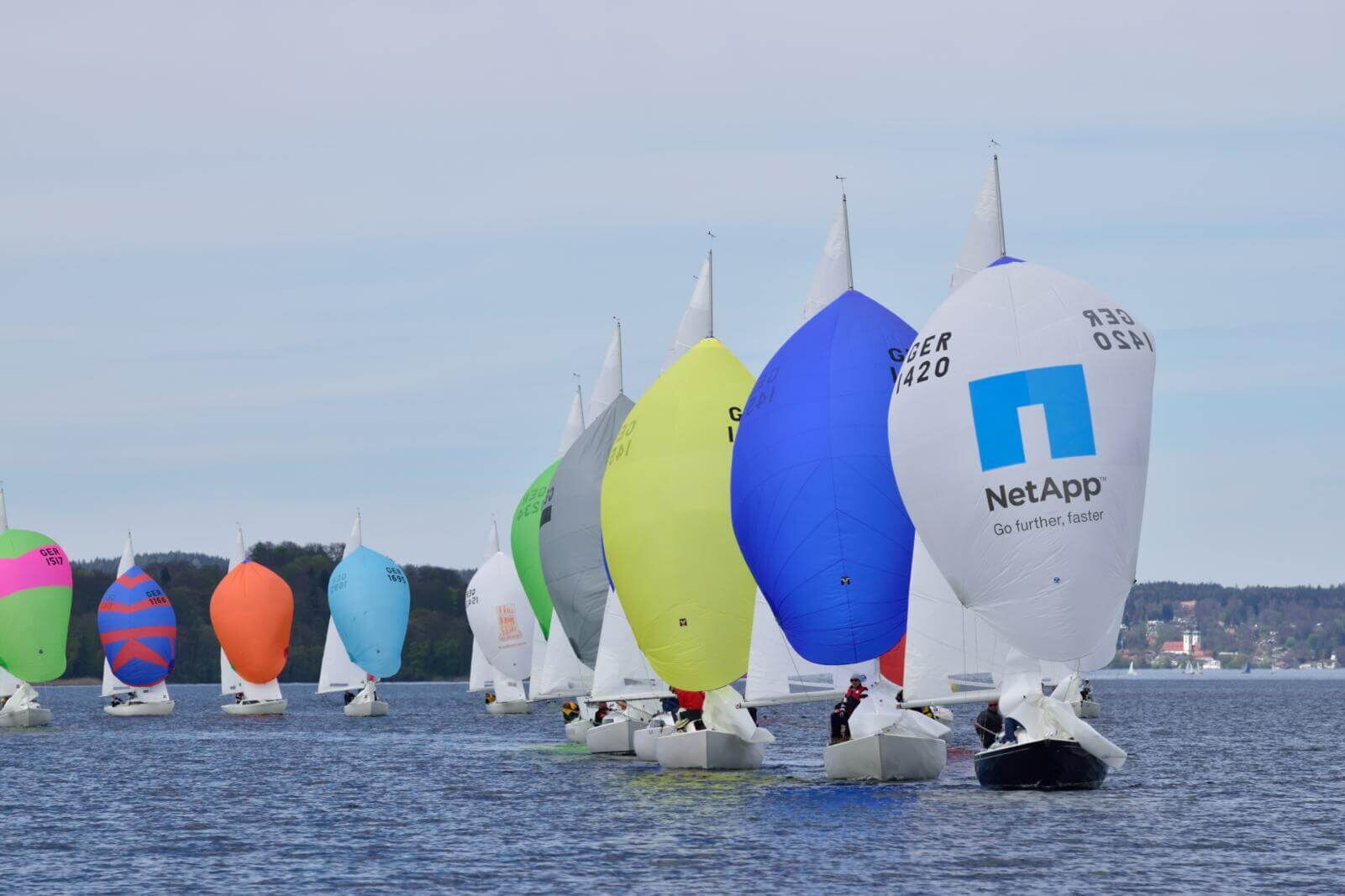 Der Samstag begann mit Sonne. Pünktlich zur Auslaufbereitschaft war auch schon eine schöne Nord-Briese in der Bucht. Wettfahrtleiter Ernst Wunder fackelte wie immer nicht lange und der erste Start wurde kurz vor 11 Uhr angesetzt. Immerhin war der Wind nur im Süden des Starnberger Sees, weiter nördlich war komplette Flaute. Dieser hielt dann für zwei volle Wettfahrten durch, die beide von uns (Peter Zauner mit Timo von Schorlemer, Maren Bertling und Anna Schorr) gewonnen werden konnten. Bei der dritten Wettfahrt wurde der Wind dann aber deutlich schwächer und diese auf eine Runde mit Zielkreuz verkürzt. Hier hatte Kai Niederfahrenhorst mit Mannschaft die Nase vorn.