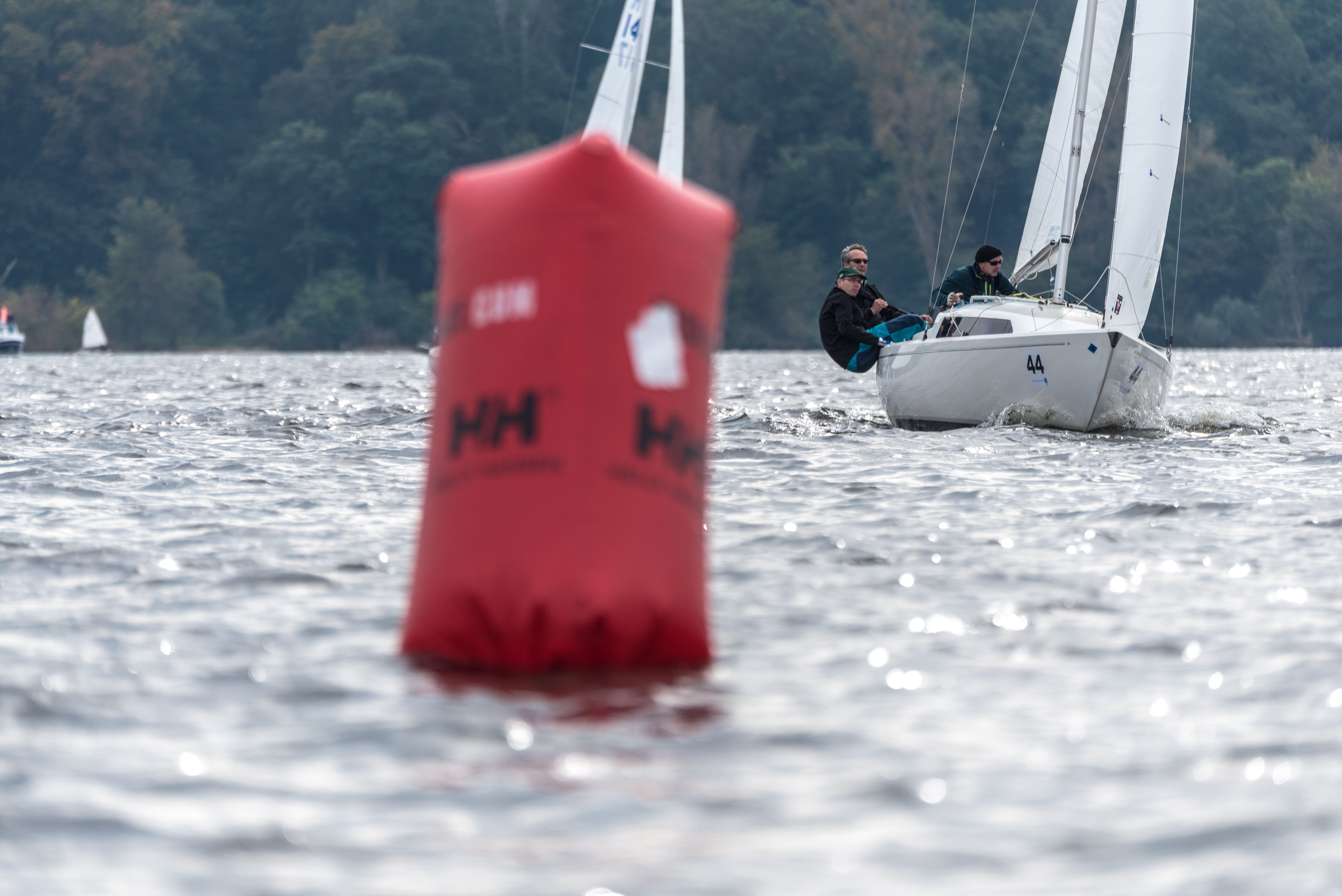 Bei dieser Windrichtung hatte ich schon einmal in Berlin gesegelt. Deshalb der Plan: Am Pin-End starten, möglichst bis zur DLRG-Station kommen, umlegen und die Luv-Tonne anliegen. Das ging auch dreimal gut. Beim vierten Mal hatte sich das Windsystem aber geändert. Bei einer geringfügigen Winddrehung nach rechts, war auf der rechten Seite auch stärkerer Wind. Vor dem Start hatte ich dieses nicht gesehen, sondern erst, als ich wegen Abwinden nach einem nicht so tollen Start einen Holeschlag einlegen musste. Weit auf der rechten Seite sah ich ganz allein Gerd Miethe (GER 1602) mit frischem Wind fahren. Ich sagte mir: „Hier wird das nichts mehr – ich fahr‘ da rüber“. Gesagt -getan, wenn auch mit weiten Bögen nach Lee, um all die vorfahrtberechtigen H-Boot Felder passieren lassen zu können. Der Erfolg gab mir Recht: An der Luv-Tonne war ich wieder vorn dabei. Für uns endete der Tag mit ausgeglichenen Plätzen 5 und dreimal 8 im Gesamtergebnis auf Platz drei. Davon hätte ich niemals auch nur in den kühnsten Träumen gerechnet. Meine Jungs waren begeistert, hatten Sie doch bei diesen schwierigen Windverhältnissen ihren ersten Bewährungstest auf dem H-Boot erfolgreich absolviert.