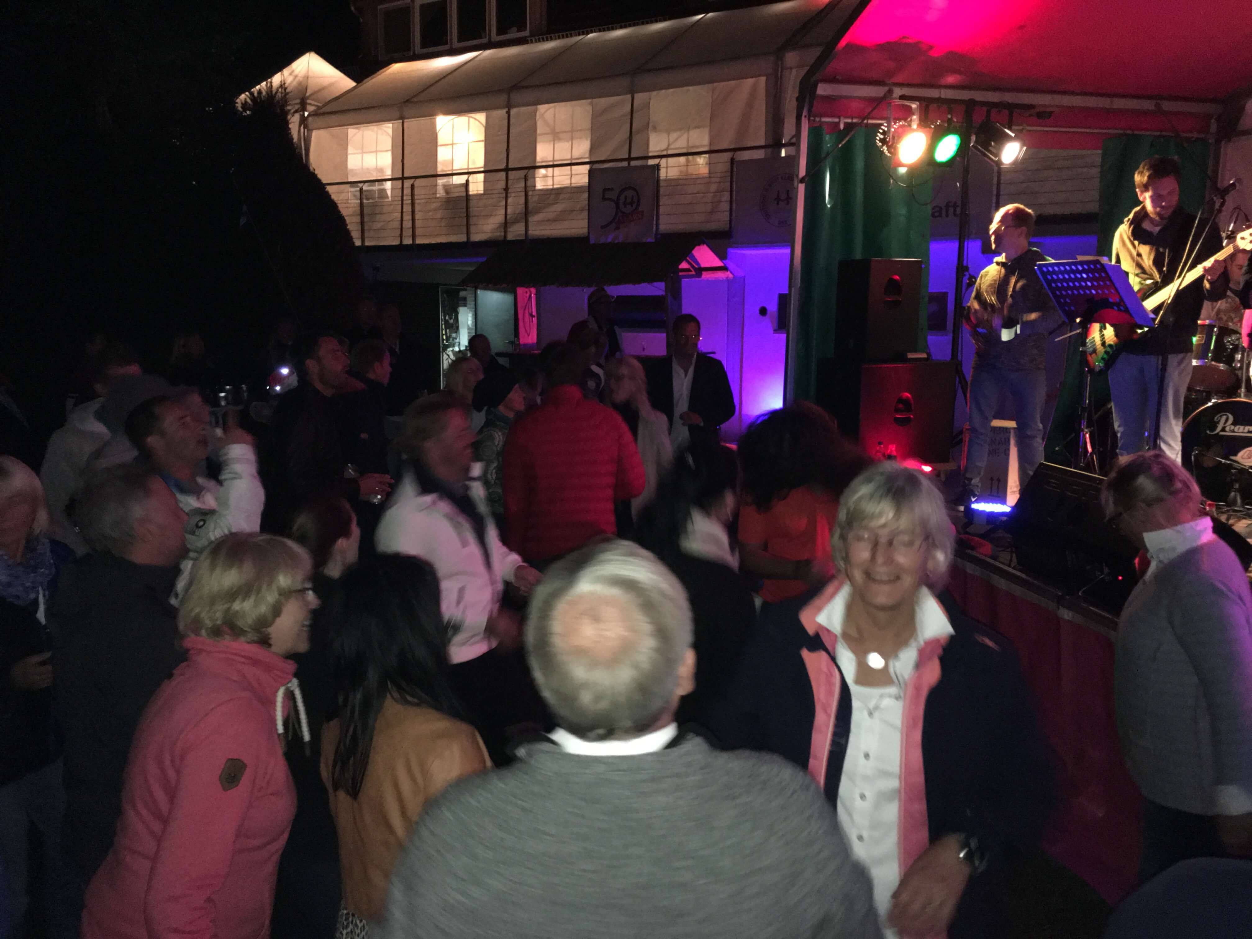 Die campierenden Mannschaften konnten die Wohnwagen und -mobile direkt vor den Stegen aufstellen. Das Clubhaus war komplett umgebaut worden. Für die 50 Jahr-Feier waren eine große Bühne, mehrere Catering-Zelte, ein Bierwagen, eine Coctailbar und ausreichend Biertischgarnituren auf der Wiese vor dem Clubhaus aufgebaut worden. Drei große Beach-Flags mit den 50 Jahre Signet rundeten das schöne Bild ab.
