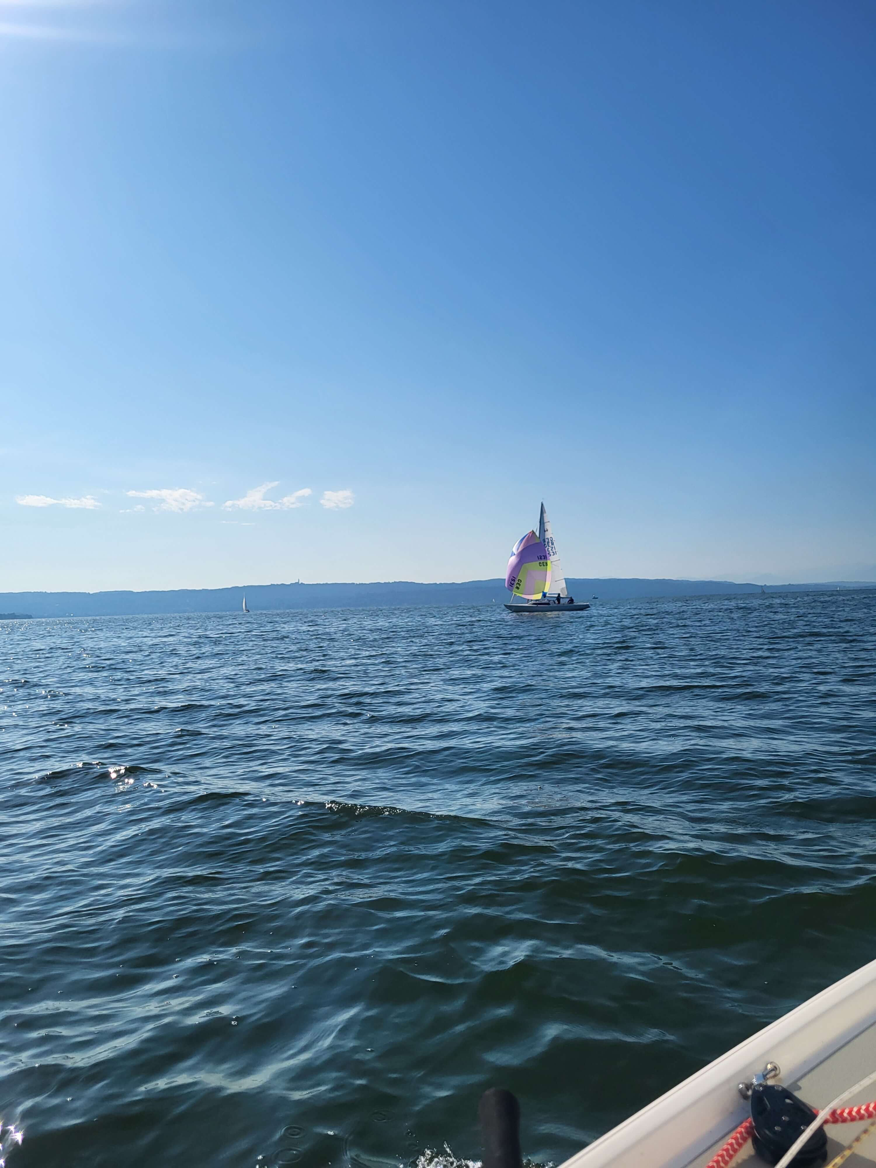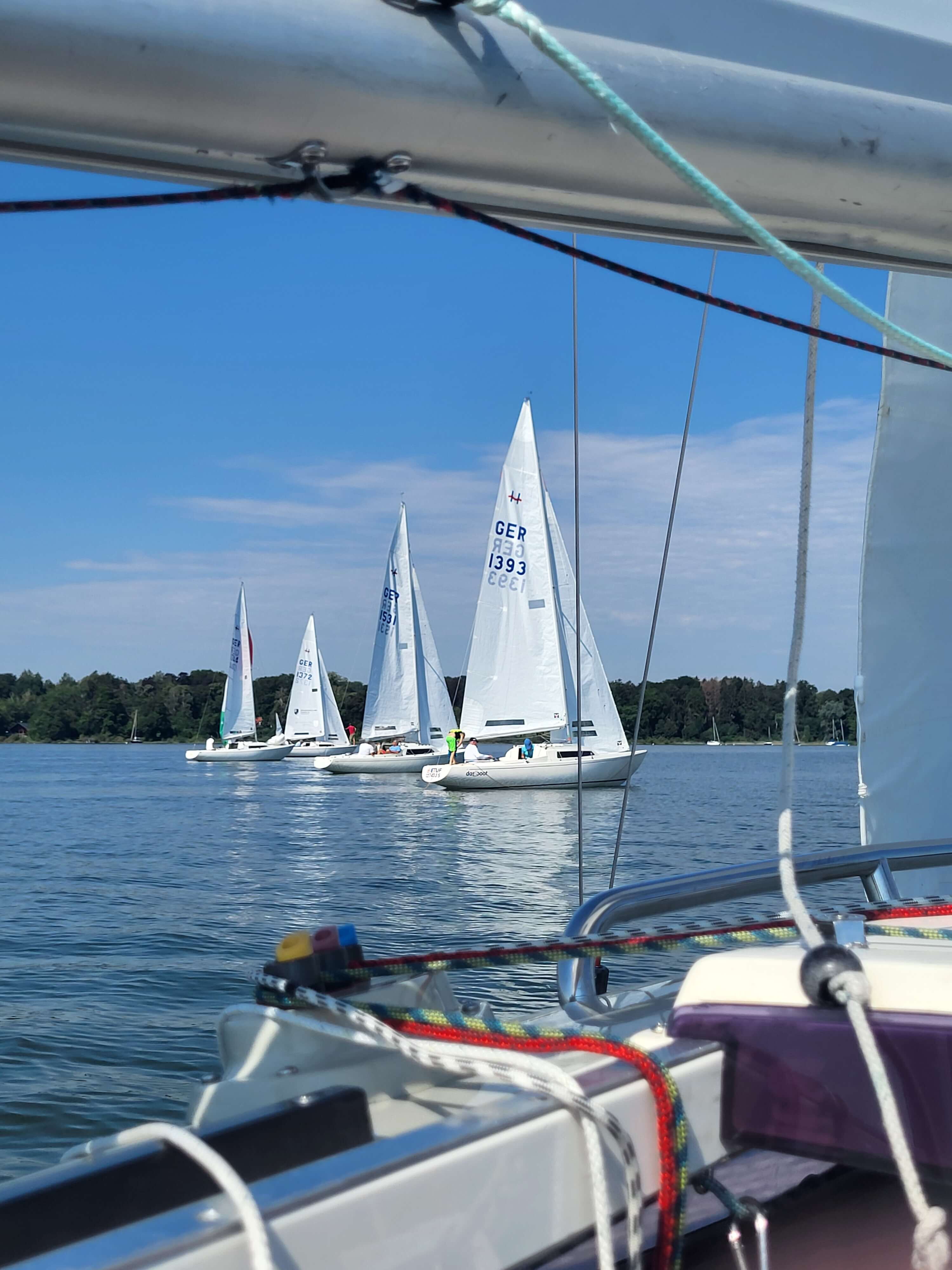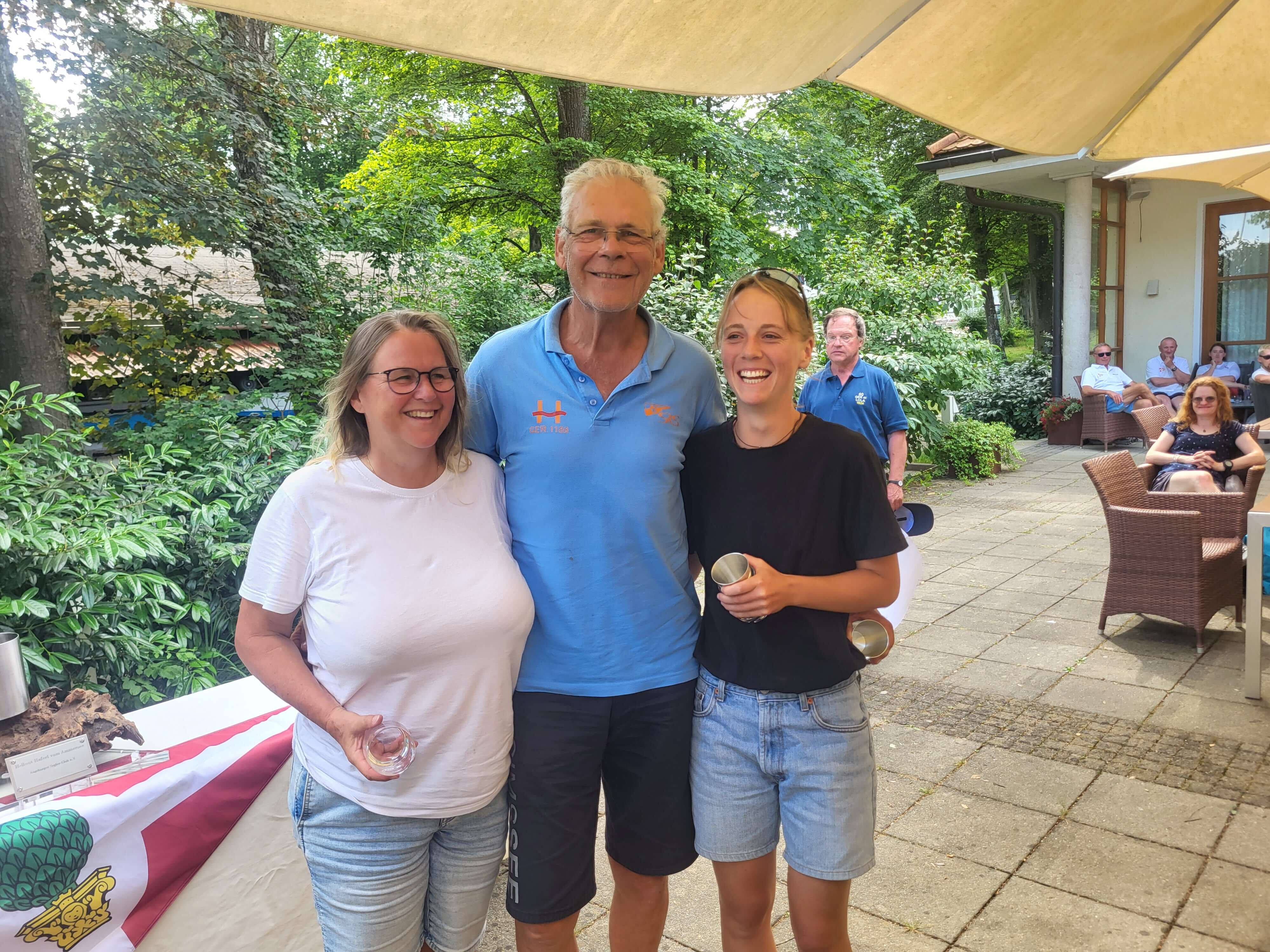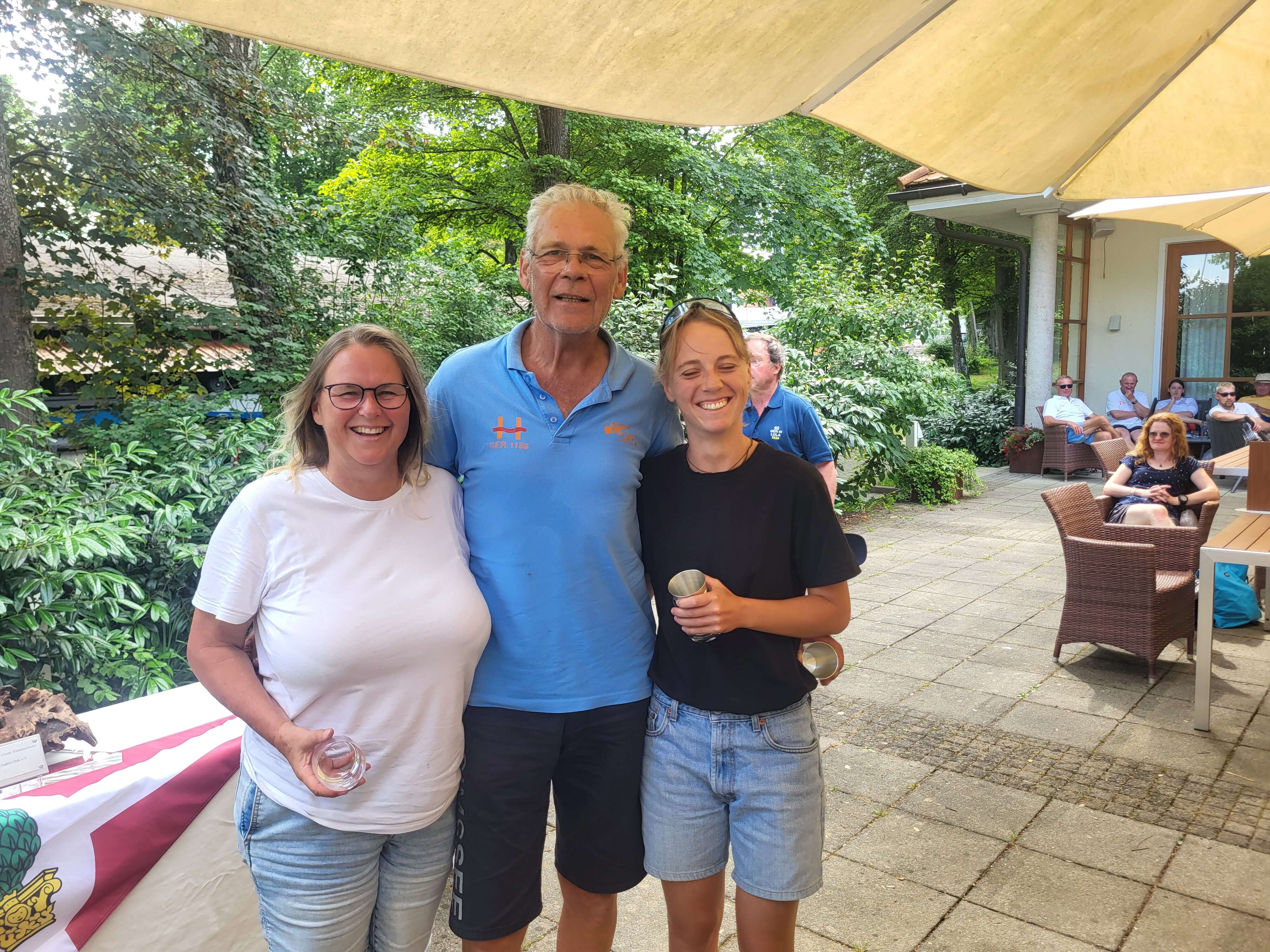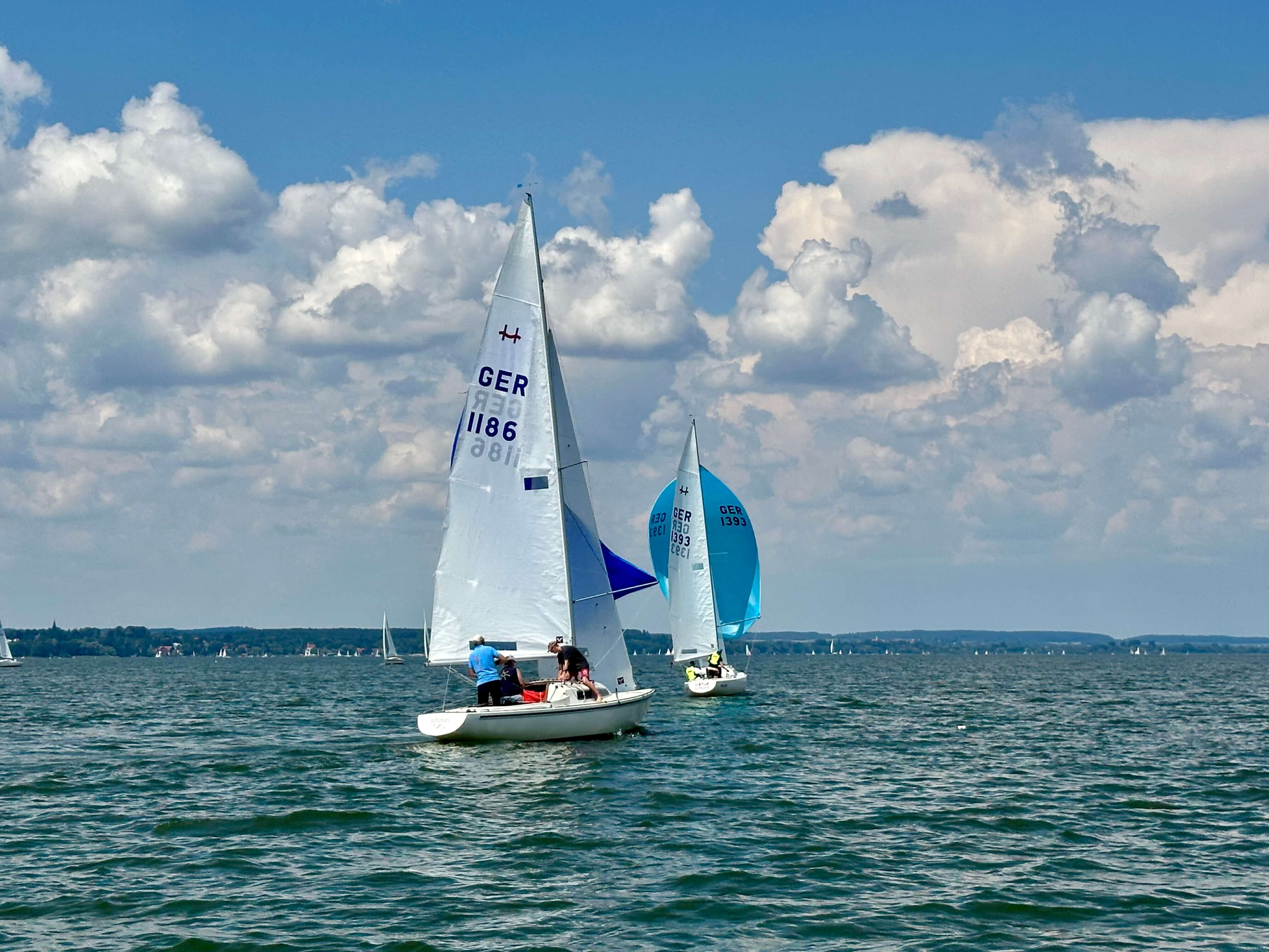 Dann ging es schnell aufs Wasser der Südwind stand noch. In der ersten Wettfahrt bei leichtem Wind, belegte die Titelverteidiger-Crew um Gerd Diederich von Simssee und Bodensee den Dritten. Zweiter wurde der Dießener Peter Teschemacher. Christoph Zander aus Essen gewann mit dem achtjährigen Flynn Barie und dessen Mutter Isabell an der Vorschot.