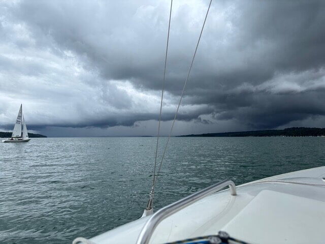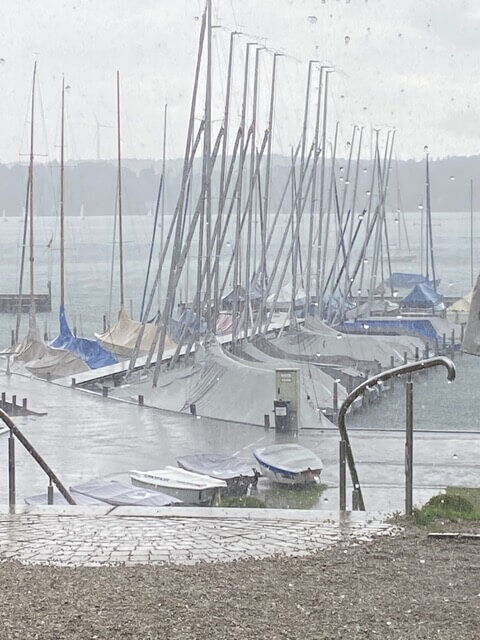 Das Wetter zeigte sich von seiner ungemütlichen Seite – grauer Himmel, Dauerregen und kühle Temperaturen. Hinzu kamen immer wieder stark wechselnde Windverhältnisse, Flaute bis hin zu Starkwind wechselten sich ständig ab. Plötzliche Winddreher und Gewitter, die das Segeln zur Herausforderung machten forderten alle Teilnehmer heraus. Doch Wettfahrtleiter Peter Fröschl und sein Team gaben sich nicht geschlagen. Mit außerordentlichem Einsatz schafften sie es, am Samstag eine und am Sonntag drei Wertungsfahrten durchzuführen. Die ständig wechselnden Winde verlangten dem Team alles ab. Die Bahnen mussten immer wieder neu ausgelegt und die Tonnen verlegt werden, um faire Bedingungen zu gewährleisten. Ein Kraftakt, der von allen Teilnehmern mit Respekt gewürdigt wurde.