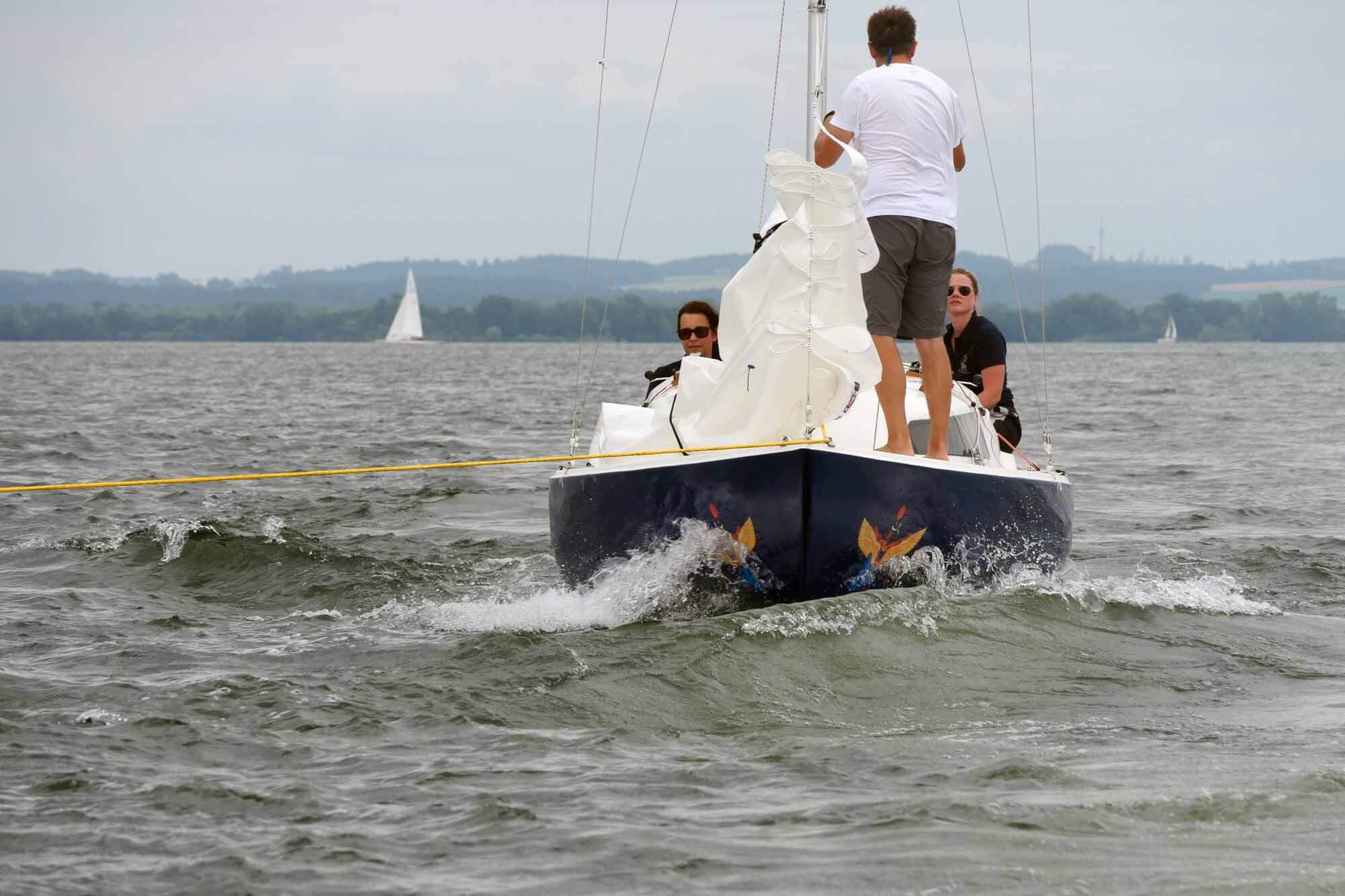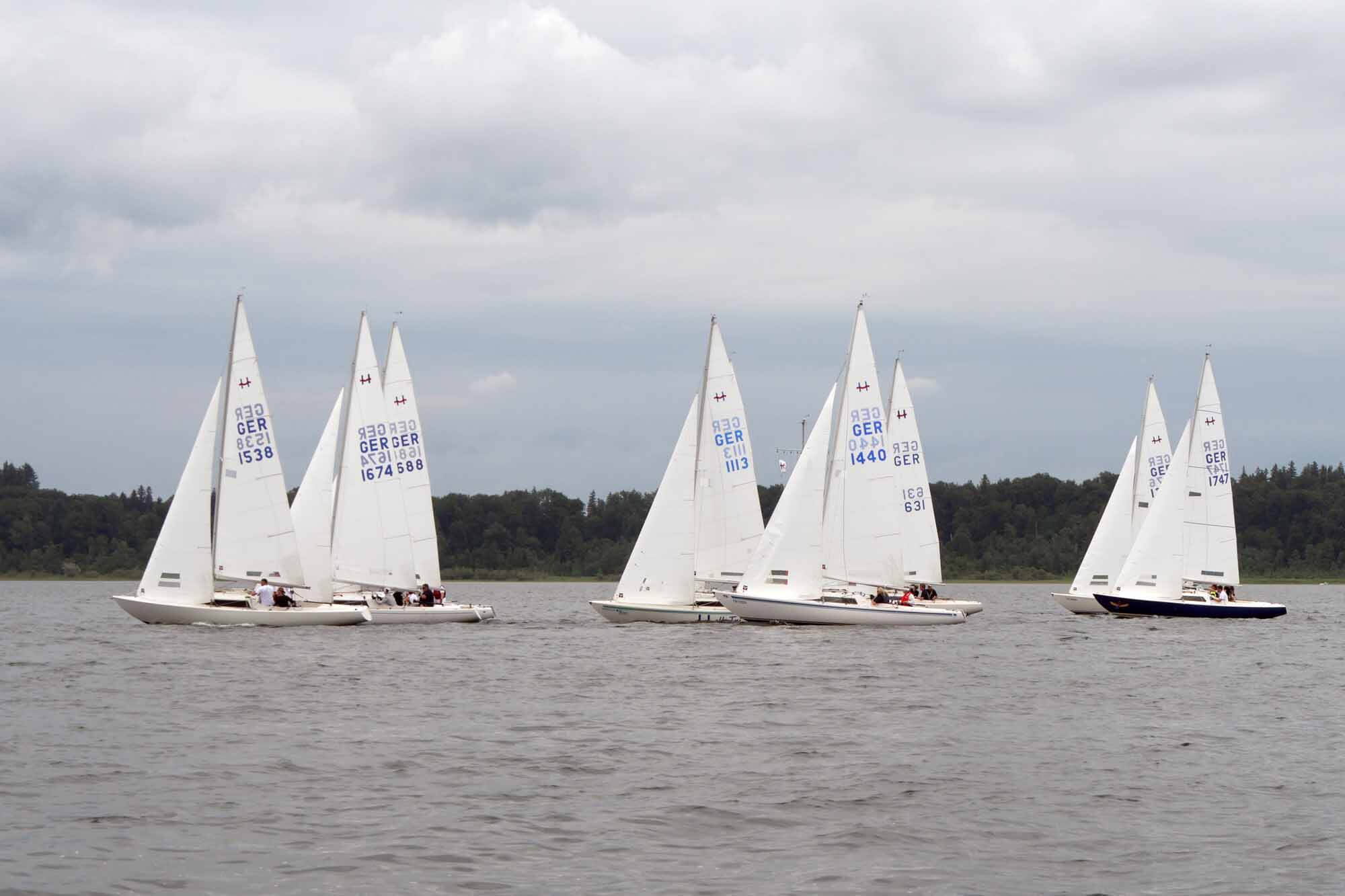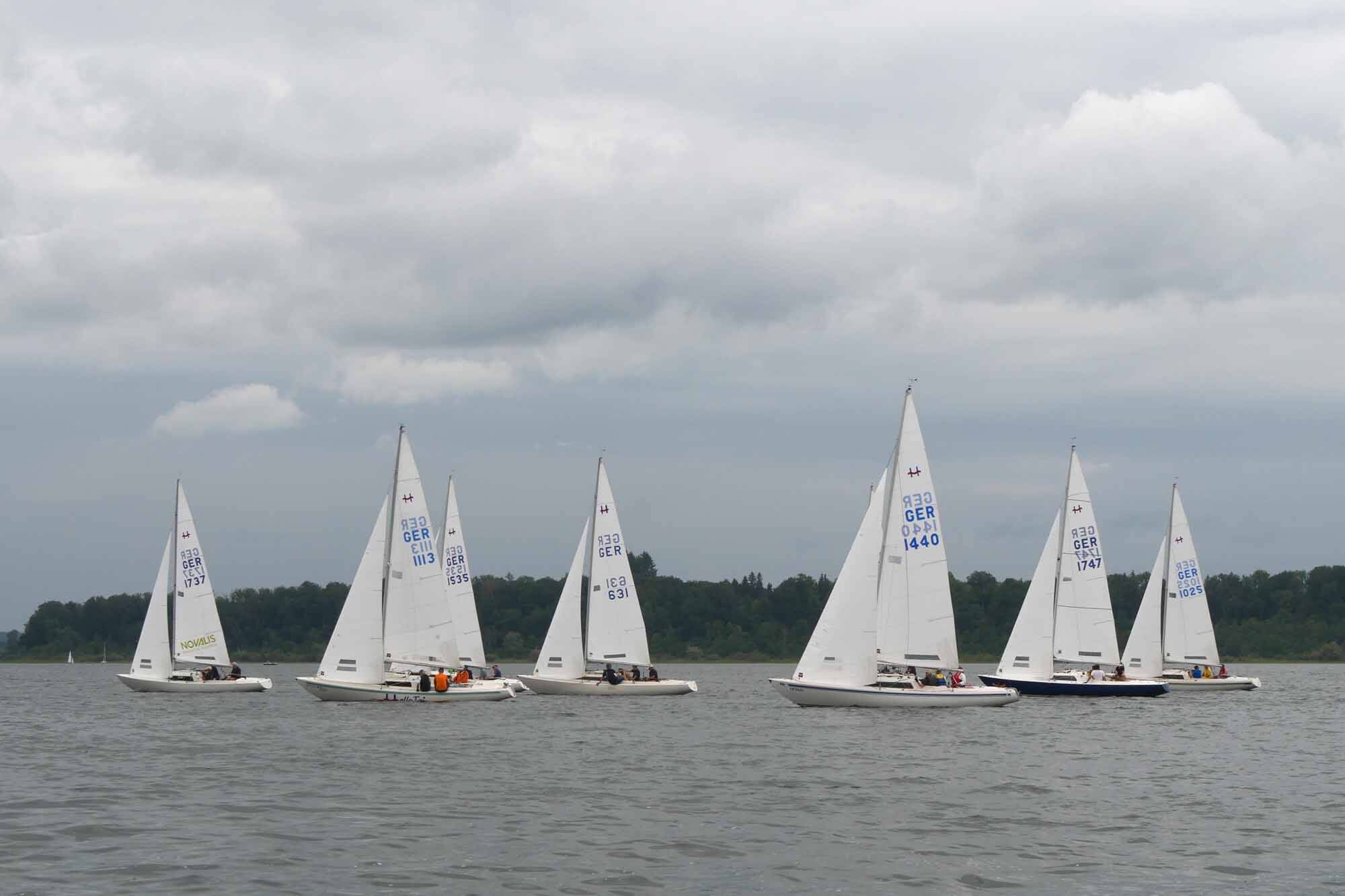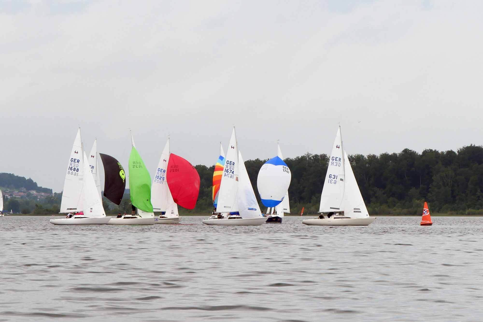 Nach vorzüglichem Grillbuffet am Abend überstanden wir die Nacht gewitterfrei. Am nächsten Tag dann Westwind und die fehlenden drei Wettfahrten konnten gefahren werden. Am Ende siegte die Crew von Dirk Stadler vor dem Düsseldorfer Boot mit Knut Viehweger an der Pinne. Den dritten Platz sicherte sich, mit einer starken Leistung, Tim Claussens Schiff vom Bodensee.