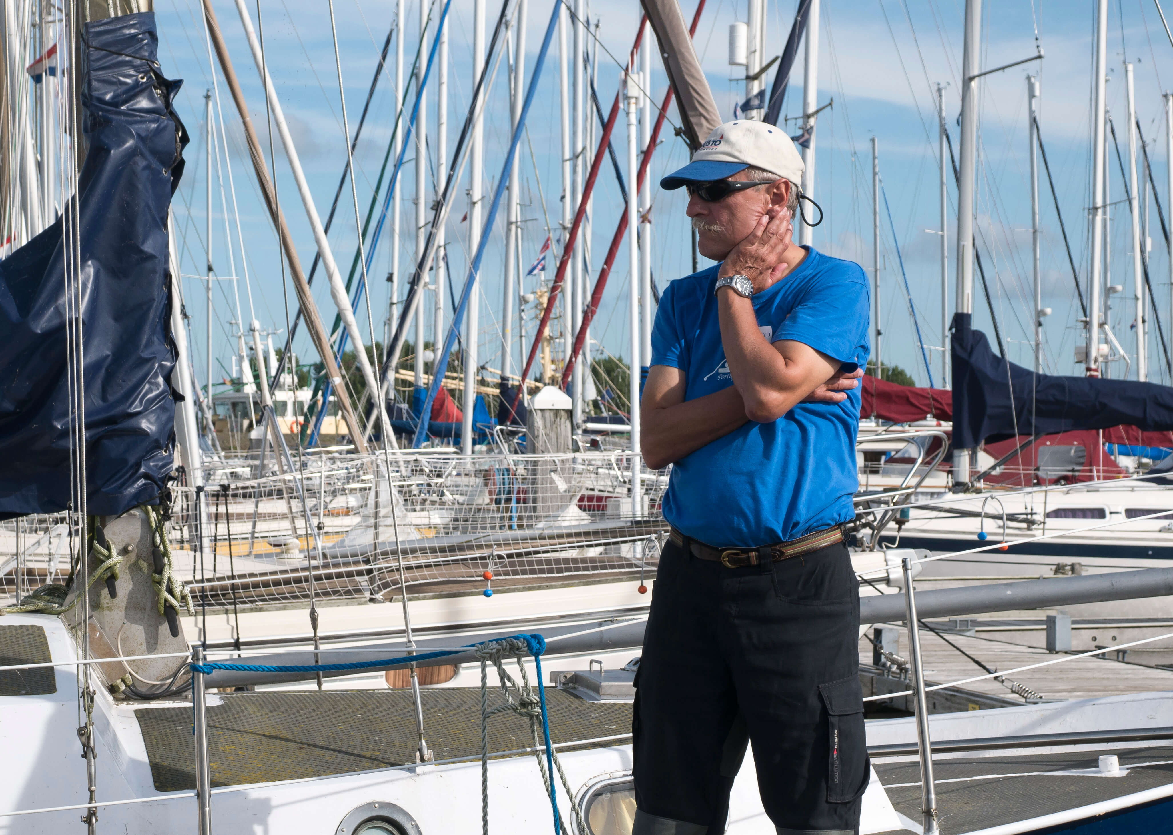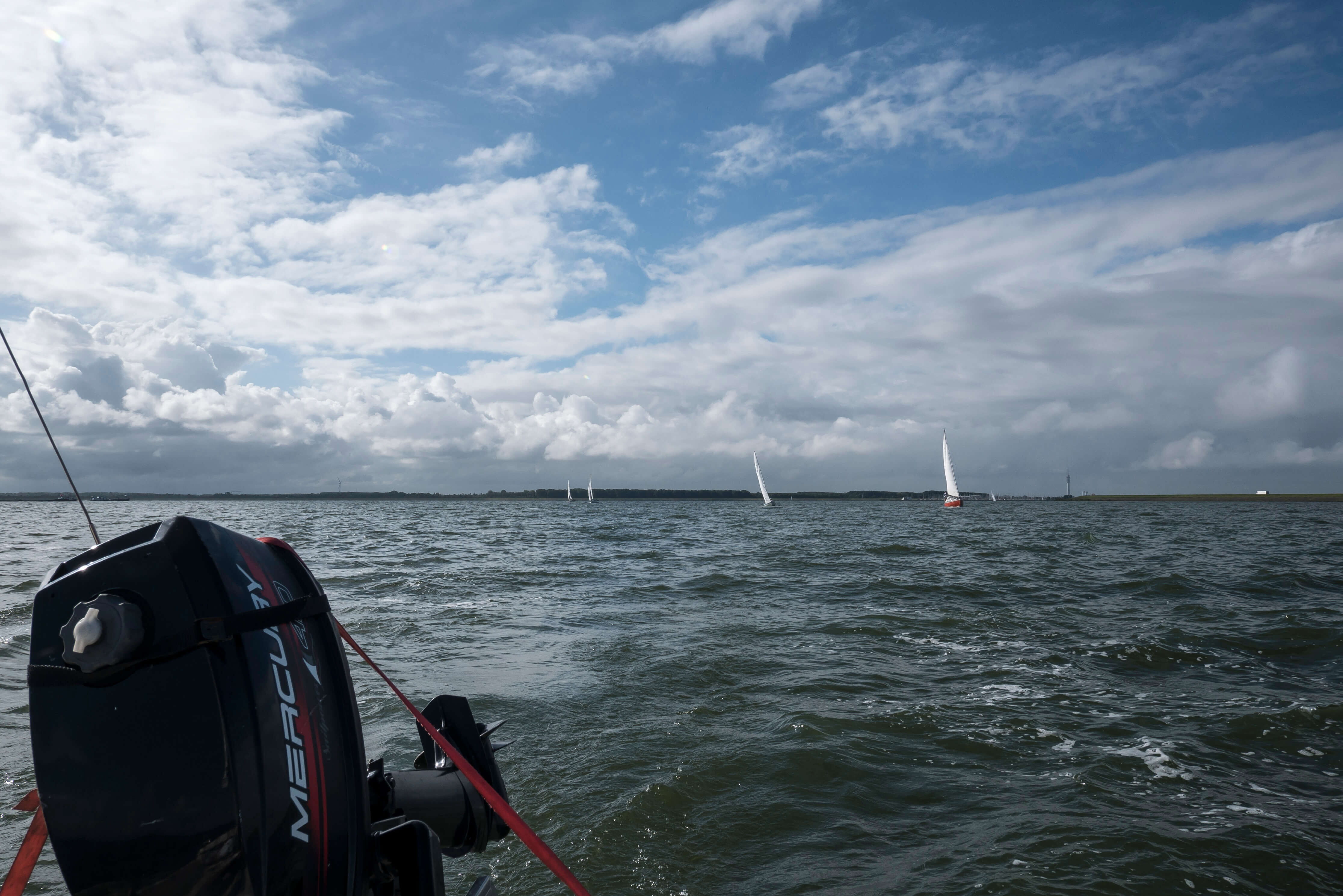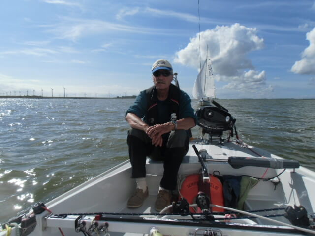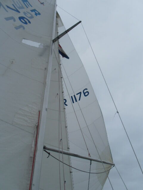 Am Samstag werden die Boote komplettiert, getrimmt, seeklar gemacht, oft in gegenseitiger Unterstützung. Dies und das lässt sich noch im nahen Segelzubehör besorgen und so gibt es einen gemütlichen Abendumtrunk an Bord eines der Boote. Wir reden über das Wetter, dass sich zunehmend ungünstig entwickelt und über unsere Segelmöglichkeiten am folgenden Tag. Die Nacht bringt bereits die Klärung, denn es pfeift gewaltig in den Masten, die Boote liegen unruhig an den Pollern und reißen an den Festmachern. Das hört am Sonntagmorgen auch nicht auf, im Gegenteil, Rasmus macht dicke Backen. Schwere Regenschauer ergänzen kräftige Böen von W 6 bis 7 Windstärken, die manchmal ½ h und mehr andauern können. Schnell sind wir uns einig, dass wir an diesem Tag nicht auslaufen werden. Die einen verbringen den Tag mit einem Ausflug in die nähere Umgebung, die anderen basteln an ihren Booten und 2 Boote gehen mit verstärkter Crew “vor die Türe“ und trainieren Starkwindsegeln, in Lee des nach Norden verlaufenden Houtribdijks. Eine gute Vorbereitung für alle Fälle. Es soll nicht unerwähnt bleiben, dass auch der Versuch eines echten “Mann über Bord-Manövers“ gestartet worden ist. Bei Rückkehr vom Trainingsschlag geht ein Segler 15m vor dem Anlegesteg außenbords. Alles ist harmlos verlaufen. Positiver Nebeneffekt: er weiß jetzt, daß und wie seine Rettungsweste funktioniert. Abends sind wir wieder beisammen und planen das Auslaufen für Montagmorgen, soweit der Wind – wie von den Foren versprochen – deutlich abnehmen wird.