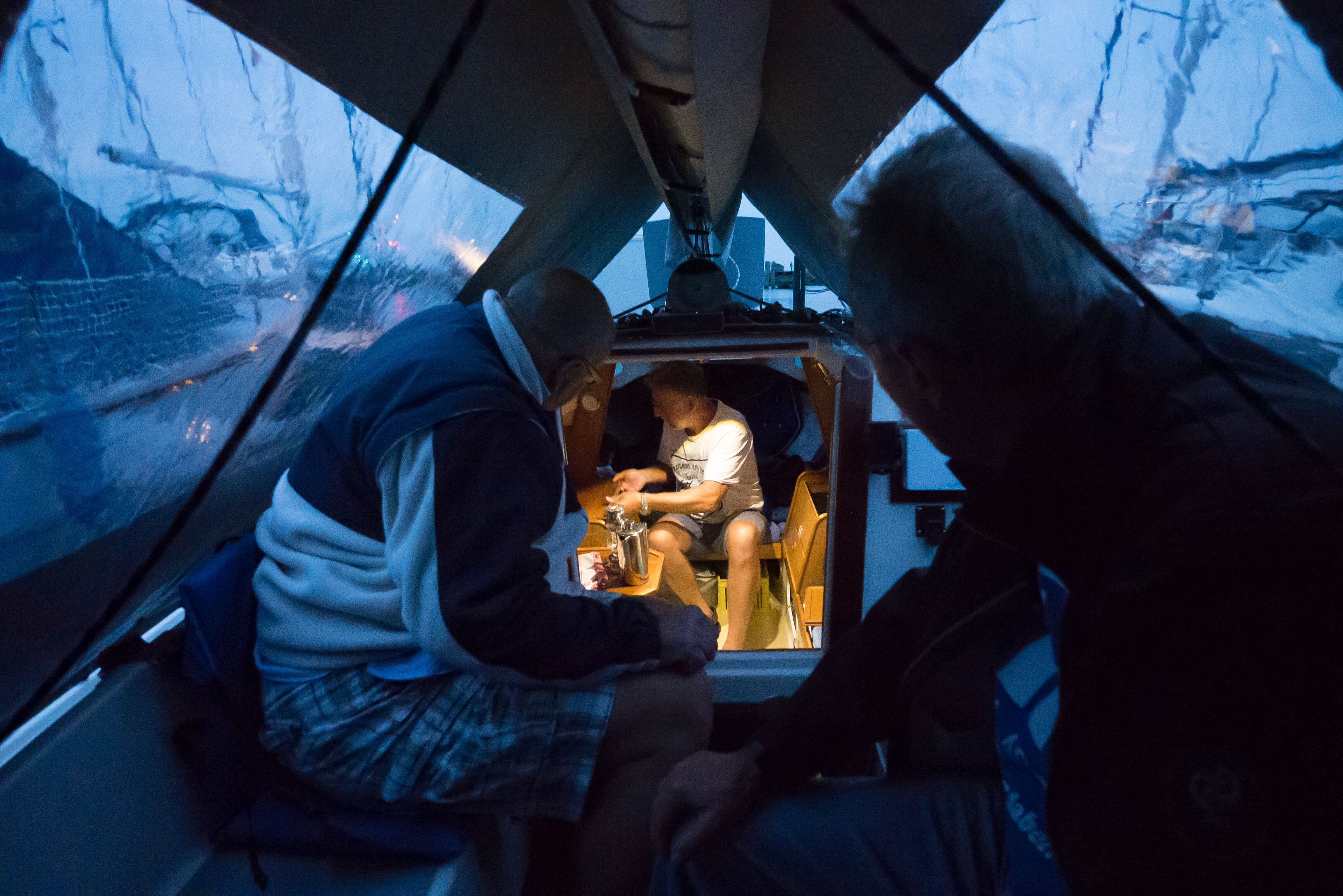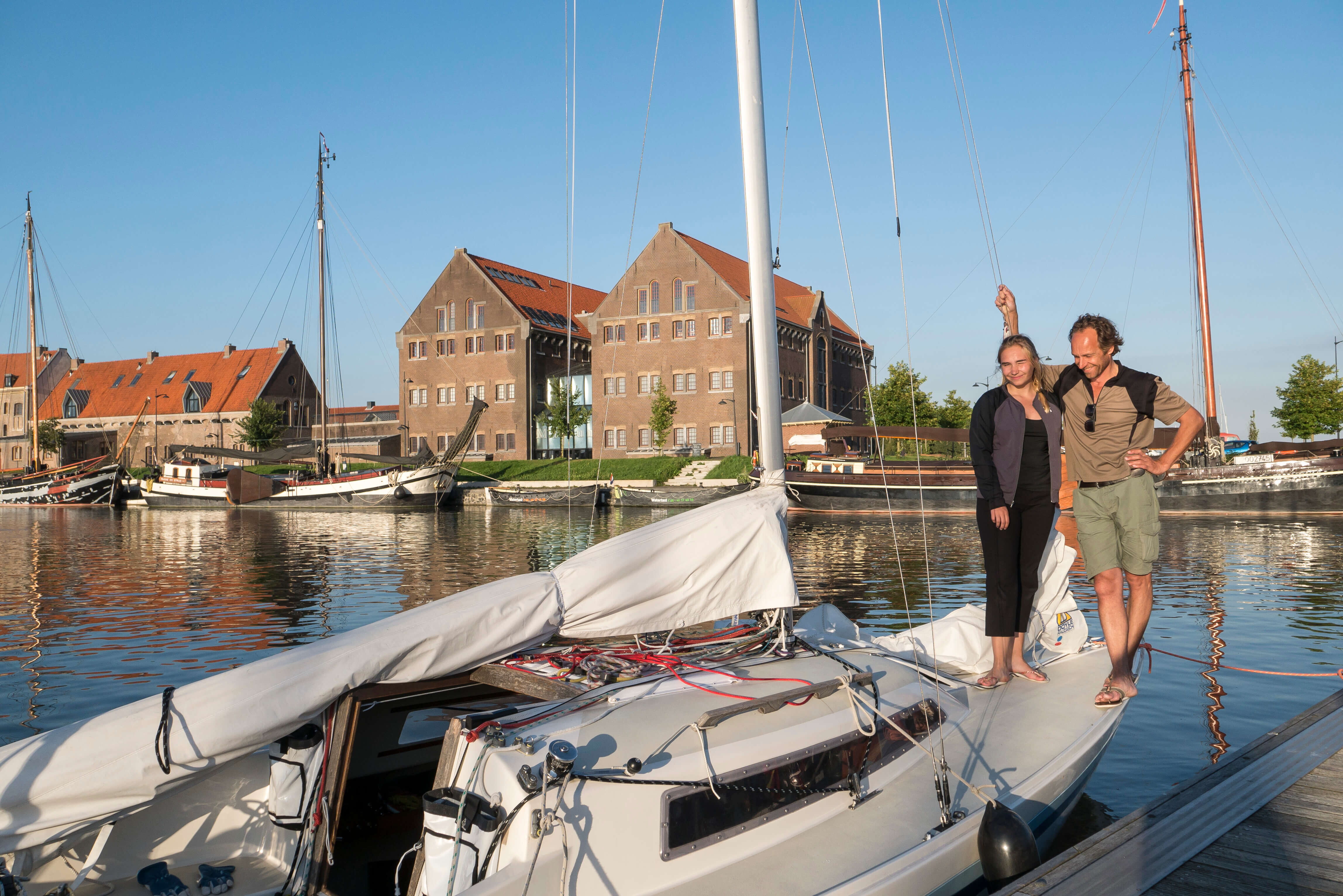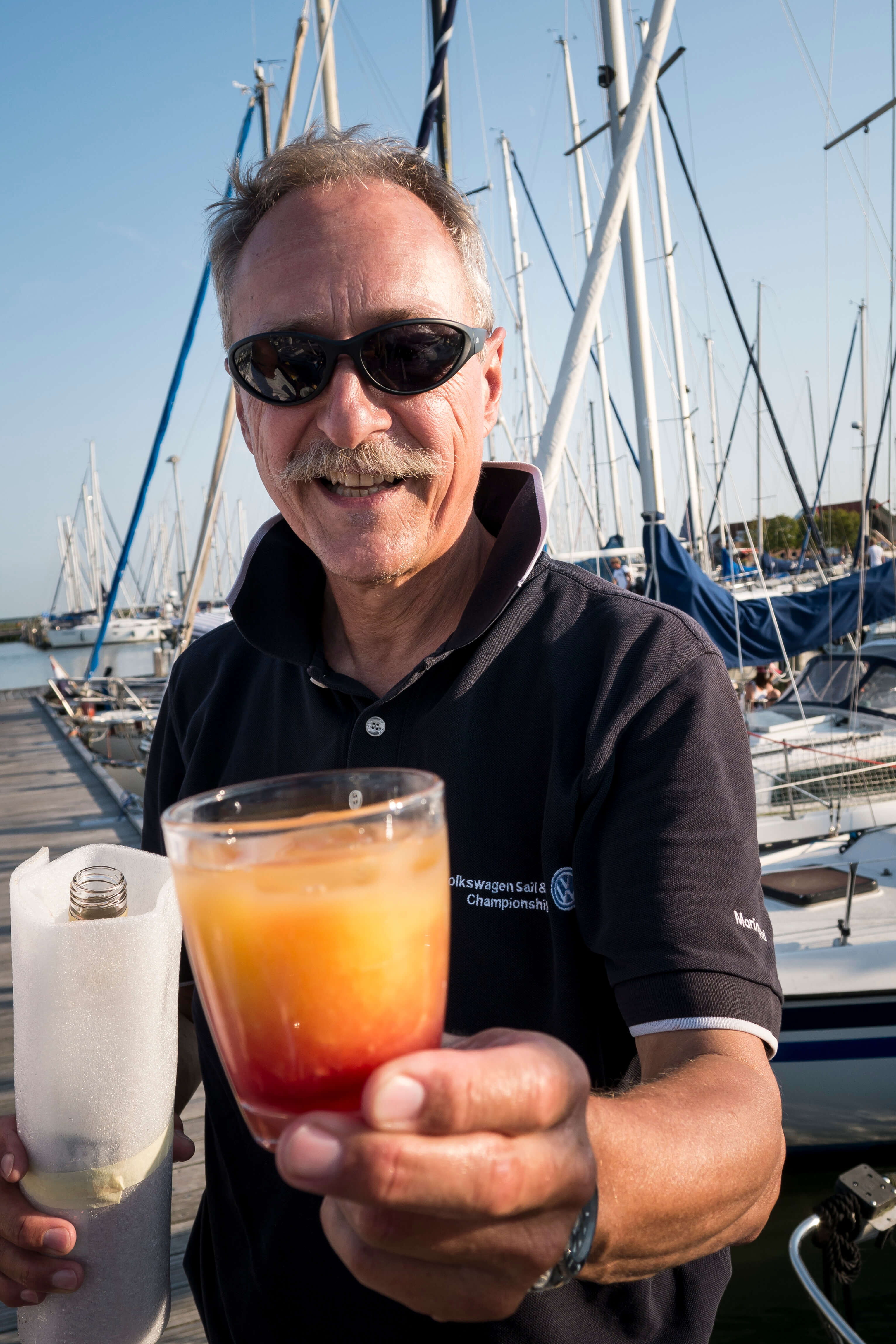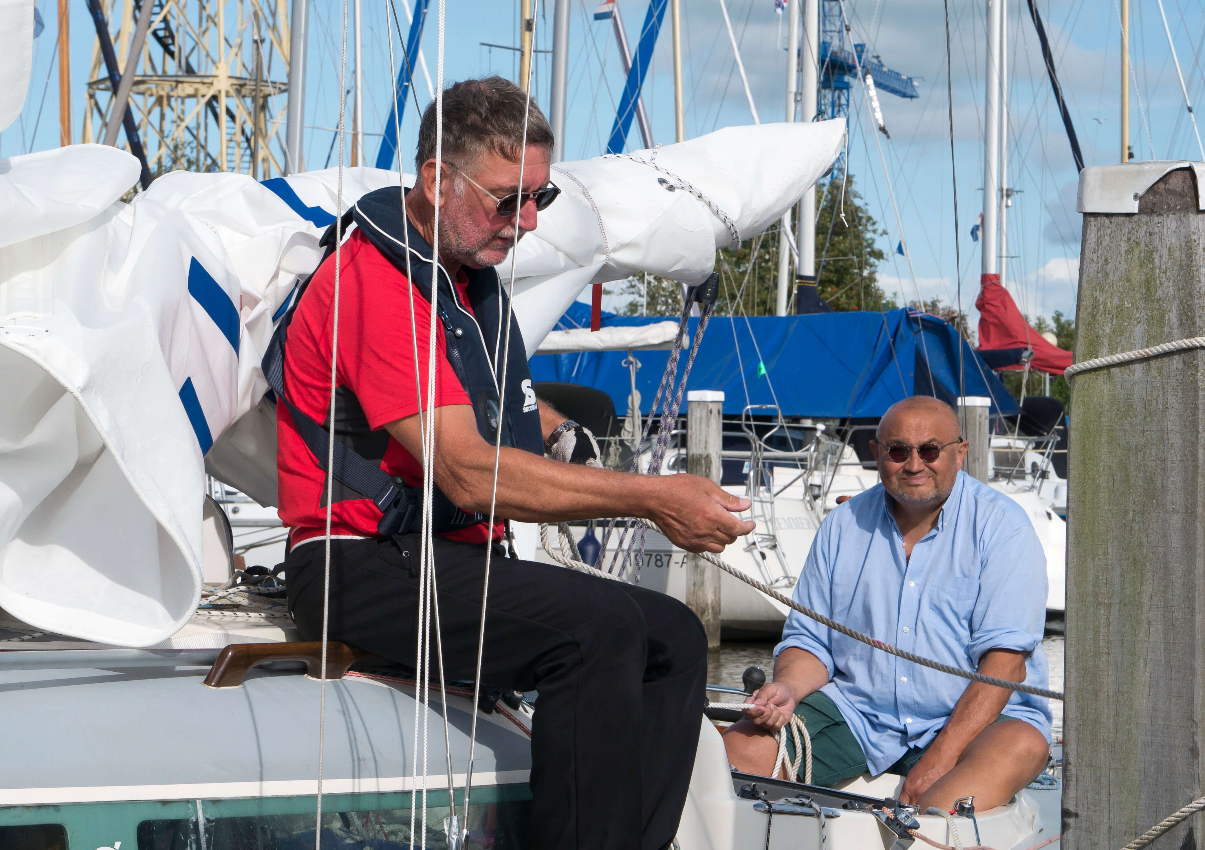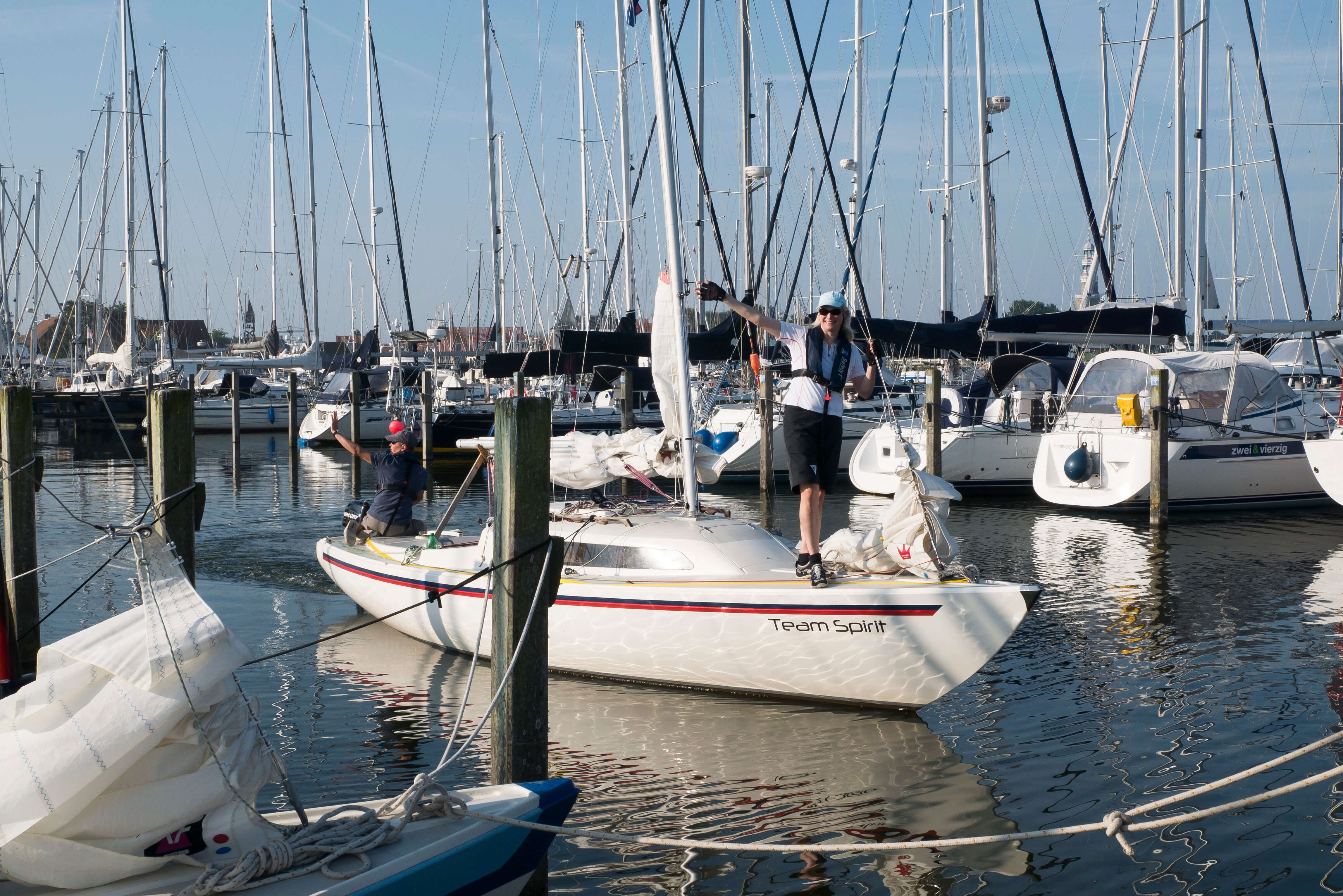 Am Mittwochmorgen gibt es dann etwas mehr Wind, der ungünstigerweise genau in die Hafenausfahrt bläst. So wird beim Briefing die Strategie des Auslaufens eingiebig besprochen, damit alle unter Segeln und mit an Deck gesichertem Motor heile herauskommen. Das klappt tadellos, die Kameraden haben’s drauf. Draußen wird gewartet, bis der Letzte es geschafft hat und schon wird Kurs genommen auf ein markantes Seezeichen mitten im Ijsselmeer (SSE), um von dort mit langem Schlag Richtung Enkhuizen zu segeln (SSW). John ist mit seiner “Bobby Dazzler“ als Erster dort und erkundet für uns die Liegeplätze. Auch das klappt wieder mustergültig. Wir scheinen das Easy-Sorglospaket gebucht zu haben. Und für den Sundowner organisiert Roland von der “Midlife“ eine Curverbox voll Eiswürfel. Wahnsinn! Wir haben einen Mords Spaß auf dem Steg, während die Segel noch ungeordnet an Deck liegen.