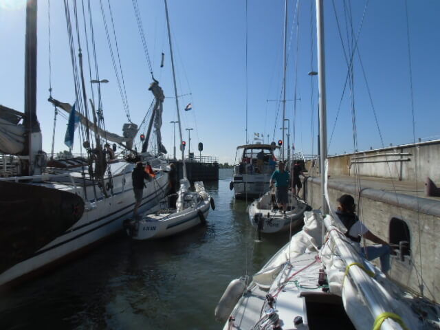 Der nächste Tag, es ist Samstag, soll unser letzter Segeltag sein. Die Taktik zum günstigsten Auslaufen bei Wind in die Hafenausfahrt wird beim Briefing besprochen, so dass alle elegant unter Segel den Hafen verlassen können. Es geht zurück zum Ausgangshafen in Lelystad. Quer über das Markermeer – fast genau E – steuern wir bei guter Brise und Sonnenschein einen Hochamwindkurs ohne Wenden, bis wir schließlich südlich der Houtribsluiz die mittlere Einfahrt in das Fahrwasser zur Schleuse erreichen. Hier ist auf dem Wasser ordentlich was los und so ziehen wir unsere Wartekreise, bis wir mit vielen anderen Booten durchgeschleust werden. Es lohnt sich kaum, die Segel zu setzen, denn bis zur Flevomarina sind es nur rd. 1,5 sm, die uns am Houtribdijk entlang führen. Das ist der Deich, der Lelystad mit Enkhuizen verbindet und das nördliche vom südlichen Ijsselmeer trennt.