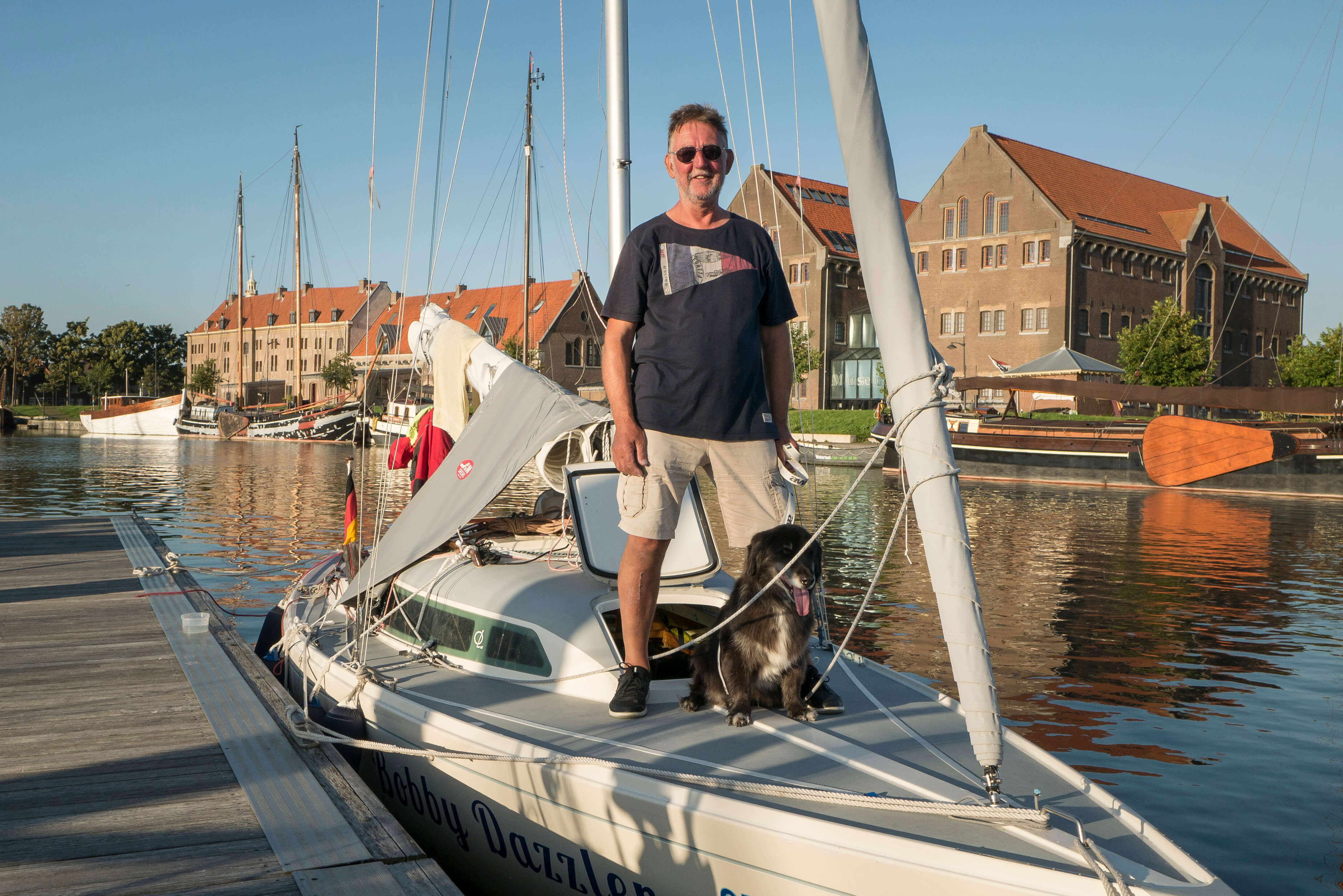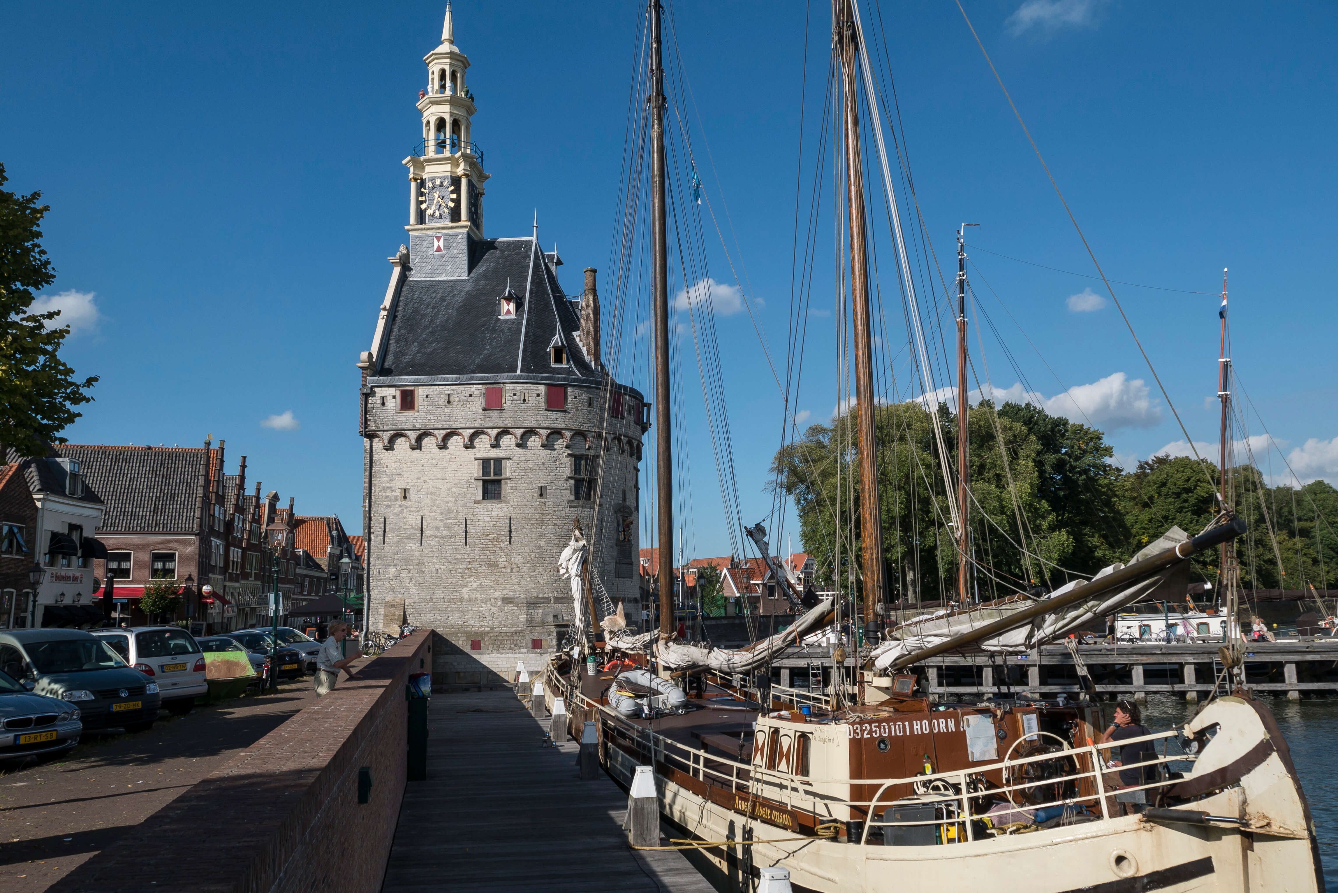 Nun empfängt uns frischer Wind, SW 4, manchmal knapp 5 Bft. Johns Elektromotor (Bobby Dazzler) braucht einen frischen Akku, just während der Schleusenausfahrt. Roland (Midlife) nimmt ihn kurzerhand in Schlepp. Gleich darauf verheddert sich dessen Fockfall oberhalb der Saling beim Setzen des Segels. Er kehrt um und klariert das mit seiner Tochter Charlotte im südlichen Schleusenvorhafen. Da aufgekreuzt werden muss und auch der Seegang etwas Bremswirkung entwickelt, ist die Ankunftszeit in Hoorn ca. 1,5 h später, als morgens geplant. Da wir hervorragende Liegeplätze im Grashaven von Hoorn erhalten, wird beschlossen, nach der Kaffee- und Kuchenrunde im Städtchen zu bleiben. Das Wetter ist warm und das Städtchen strahlt mit seinen historischen Gebäuden ab der Hafeneinfahrt eine urige Atmosphäre aus. Die Flottille fühlt sich wohl …