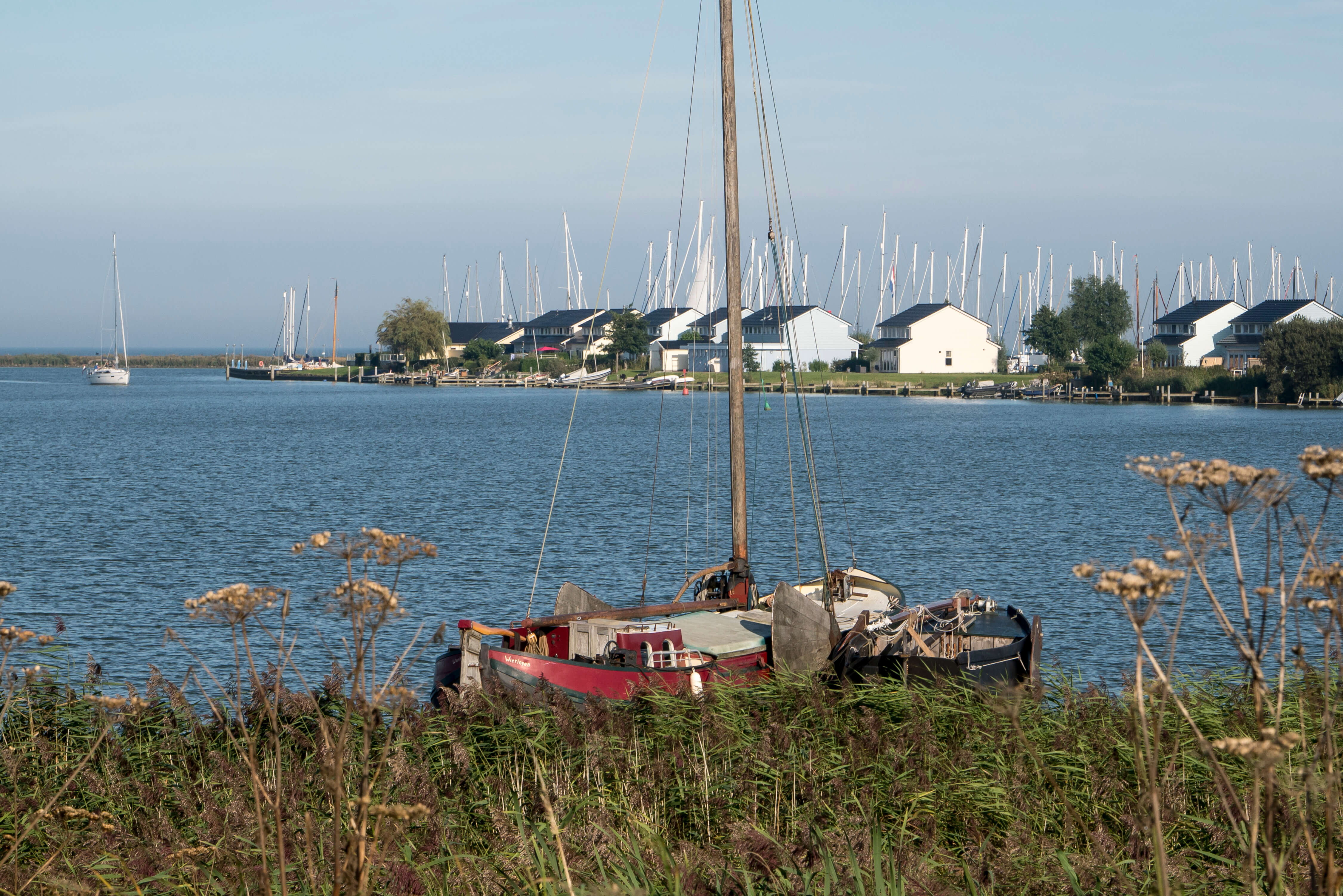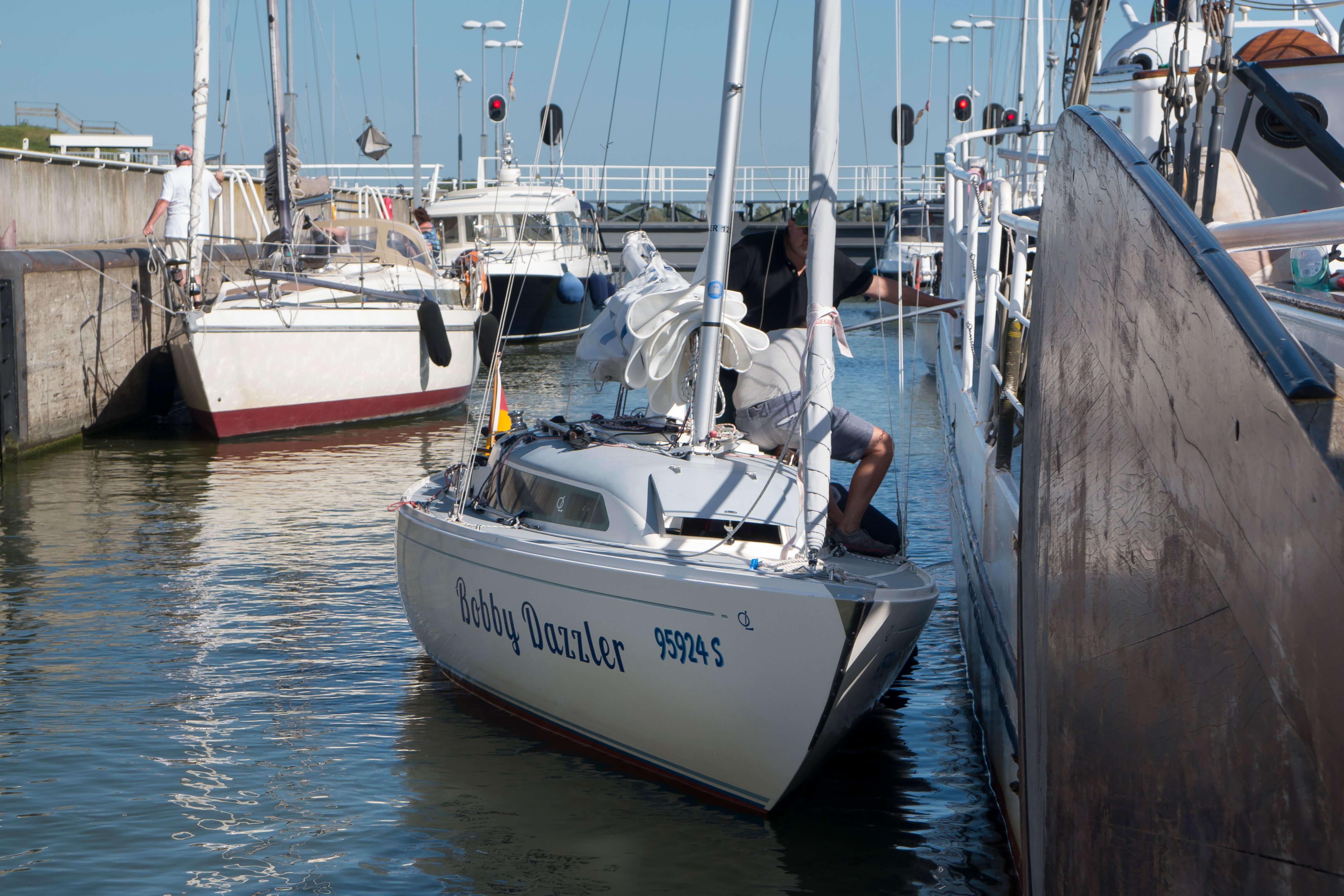 Wir starten morgens, ohne die Segel zu setzten, denn zunächst gilt es, die ca. 1 sm entfernte Schleuse zwischen dem nördlichen Ijsselmeer und dem südlichen Markermeer zu passieren. Beide Meere zusammen ergeben die Restfläche der ehemaligen Zuiderzee, soweit sie nicht zu Land eingepoldert worden ist. Ein Berufsschiff hat Vorrang, in unserer Schleusenkammer liegt bereits ein Tradionssegler, ein sogenannter Klipper der älteren Generation. Viele verschiedene Traditionssegler und Plattbodems – das sind Plattbodenschiffe und die haben keinen Kiel, stattdessen große Seitenschwerter - haben wir bestaunen können. Wir haben genug Platz und schleusen gemeinsam mit ca. einem Dutzend anderer Boote. Der Schleusenhub ist kaum wahrnehmbar und deshalb geht auch alles ganz schnell. Eine leichte Angelegenheit zur Übung. Gerade ist der Jockel abgeschaltet, darf er auch schon wieder gestartet werden.