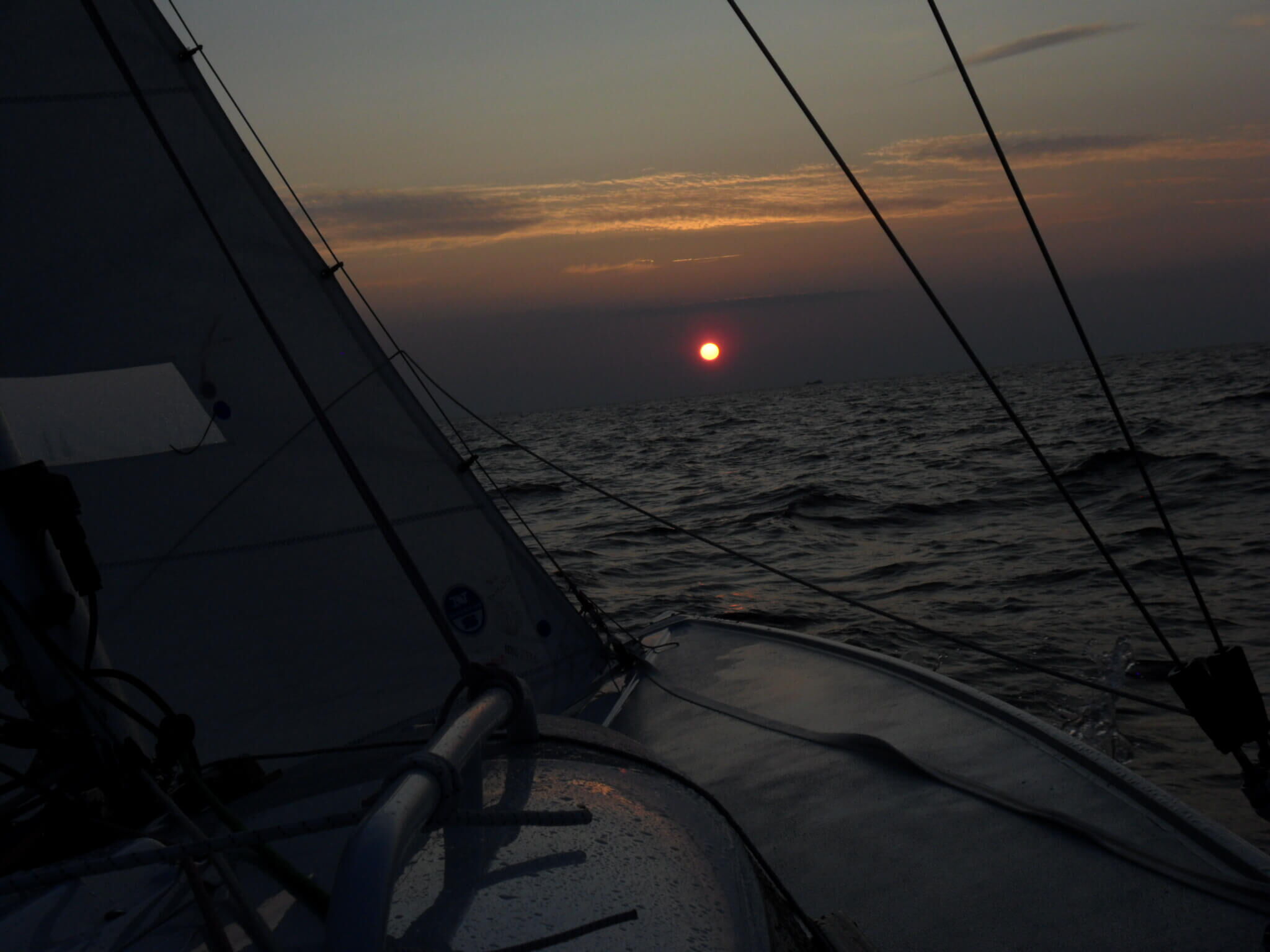 Kein morgendliches Briefing in der Dunkelheit. Aufstehen um 03.40 an Bord Semper Fidelis. Alle sind leise, aber emsig beschäftigt, ihre Boote auslaufklar zu machen, die Positionslampen leuchten und die Außenborder beginnen ihre Musik zur ungewohnten Zeit. Alle sind pünktlich draußen. Bei Flaute motoren wir die 7 sm, um pünktlich an der Schleuse zu sein. Glattes Wasser (mit halber Kraft 4,5 kn), völlige Finsternis, Sterne am Firmament, nur die Positionslaternen zeugen von der Anwesenheit unserer kleinen Gruppe. Bald werden die Lichter der Seeschleuse Kornwerderzand am Horizont voraus sichtbar, während über Steuerbord (im Osten) der Morgen graut. Bald färbt die noch verborgene Sonne den Osthimmel orange. Wir sind pünktlich im Schleusenvorhafen und es dauert nicht lange, bis uns die grünen Lichter die Schleuseneinfahrt erlauben. Der Andrang ist überschaubar. Mit uns schleusen noch zwei weitere Tourenyachten. Die Autobahnbrücken öffnen sich wie auf Bestellung und wir sind zu Stillwasser im freien Seeraum. Mit dem Sonnenaufgang im Rücken geht es nun Kurs West mit zunehmendem Schiebestrom. Texel … wir kommen!