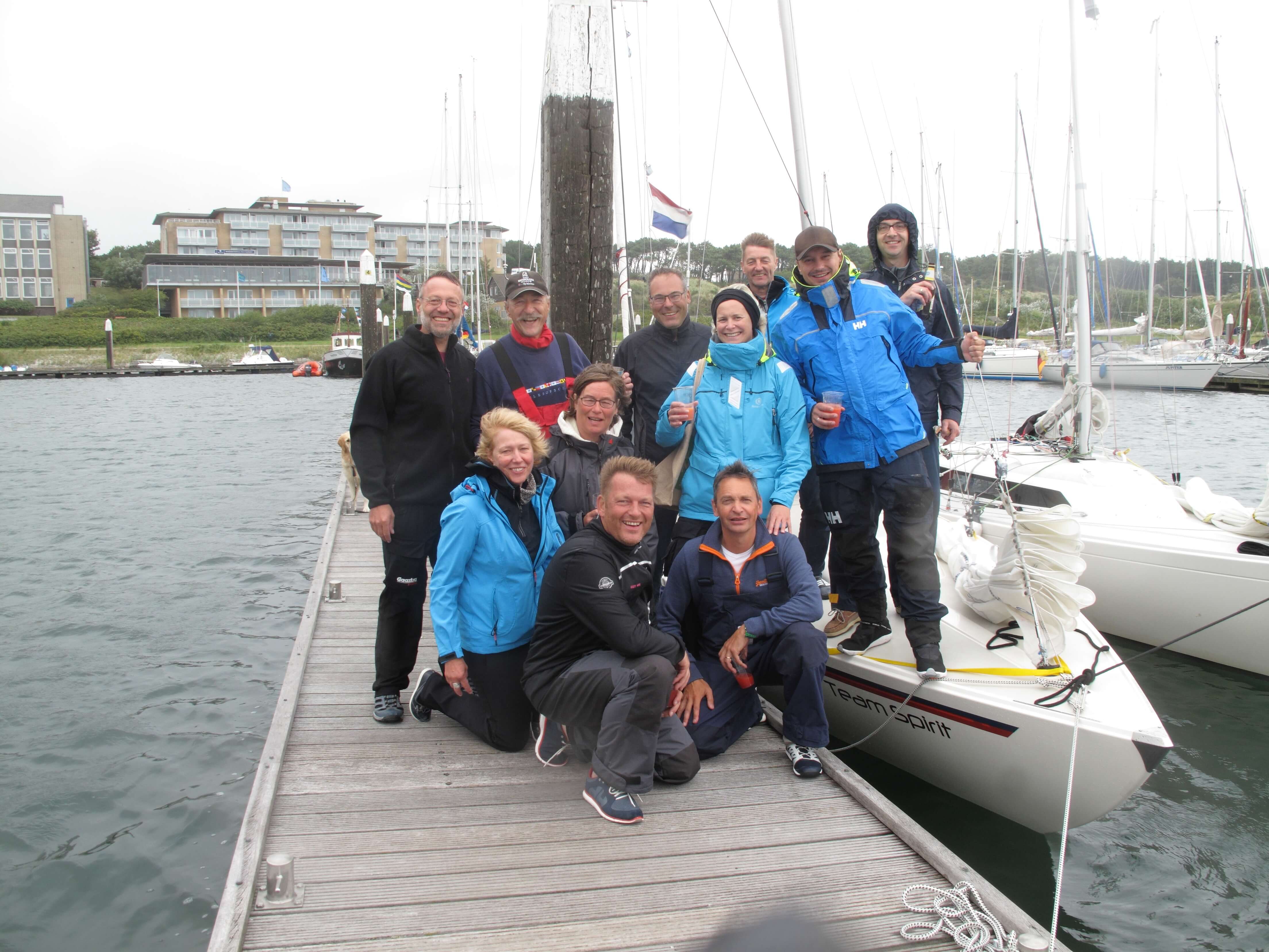 Im breiten und tiefen Texelstrom nimmt unsere Formation die unterschiedlichsten Reihenfolgen an. Mal in Reihe, mal nebeneinander, das Watt ist hier weit … Allen macht es sichtbar Spaß. Der Himmel ist freundlich und aus der nächtlichen Flaute ist eine “gentle breeze“ geworden. Und soweit möglich, werden vormittags die Spinnaker gelüftet. Ein tolles Bild. Wir hängen so manches Dickschiff ab. Den Hafen Oudeschild erreichen wir mühelos bereits am frühen Mittag. Bei der Einfahrt müssen wir einen gehörigen Vorhaltewinkel einhalten, denn der Strom vor der Hafeneinfahrt setzt mit rd. 1,5 – 2,0 kn quer. Wir freuen uns, alle am gleichen Steg Platz gefunden zu haben und nehmen ein erstes Einlaufbierchen aus den Kühlschränken (!) der “Ducky“ und der “Ginger“. Solchen Luxus ist der Organisator gar nicht gewohnt. Alle sind happy, so schnell die 26,8 sm geschafft zu haben.