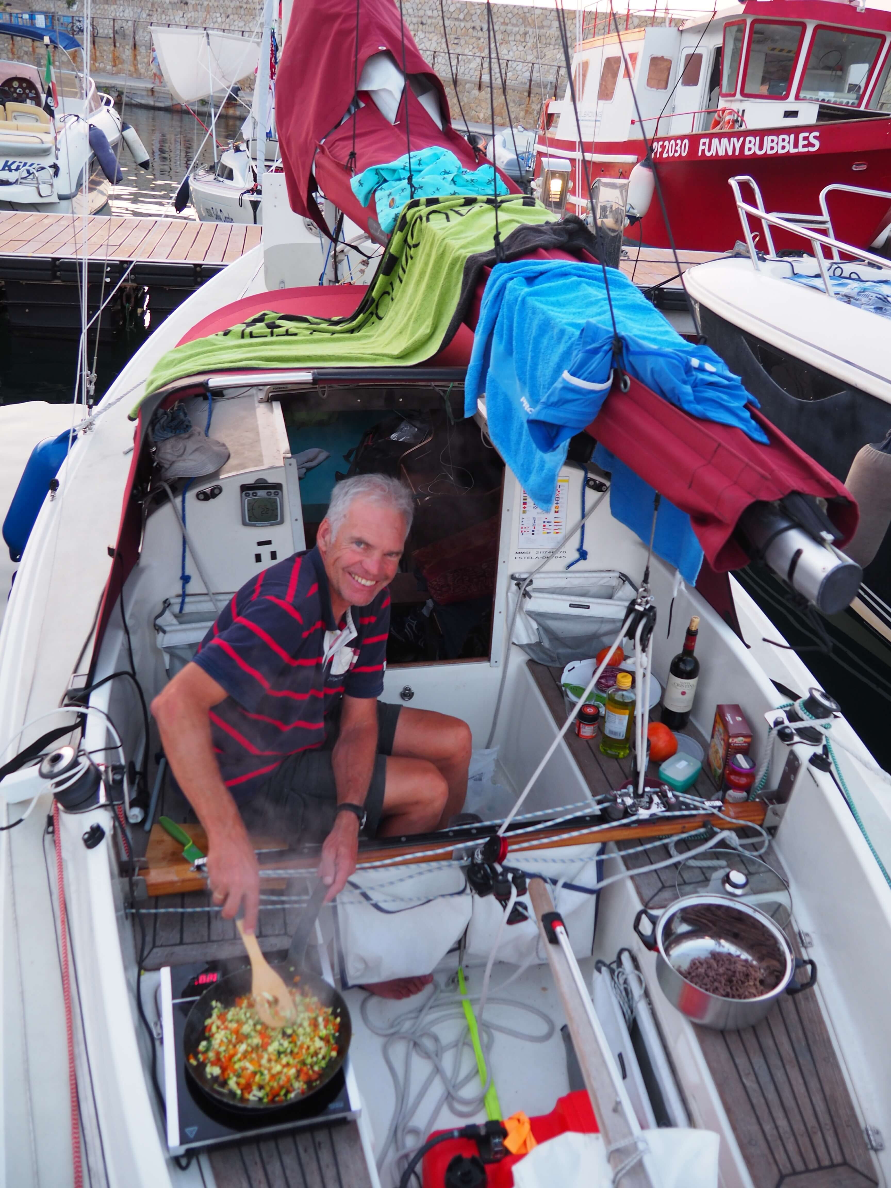 sundowner unter dem Monte und …diesmal Essen an Bord, Thomas kocht für uns vier heute leckeren Kuskus, als Nachtisch gibt es Cantuccini mit Espresso und Vino.