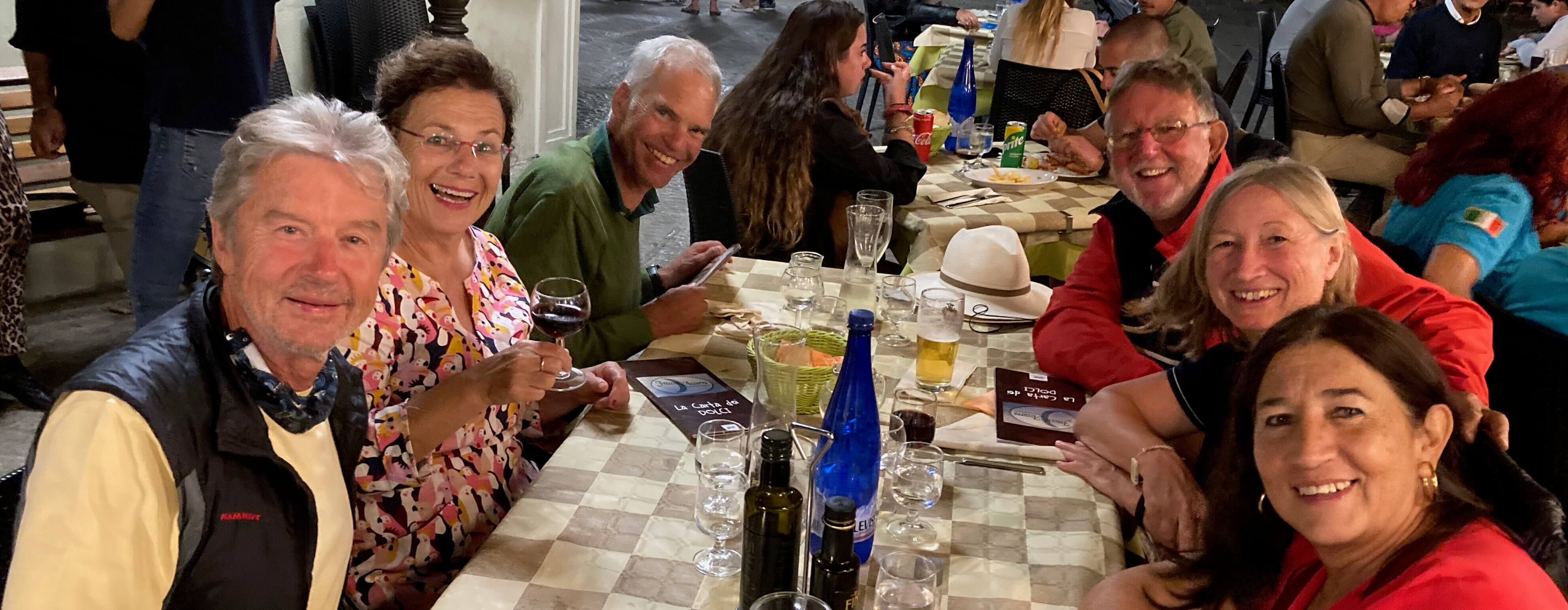 Danach gehts auf die schöne Piazza des Bergdorfes mit Apero, Bummel durch die historische, malerische Altstadt und Abendessen auf der Piazza mit unseren Segelfreunden Petra, John und Thomas und Familie.