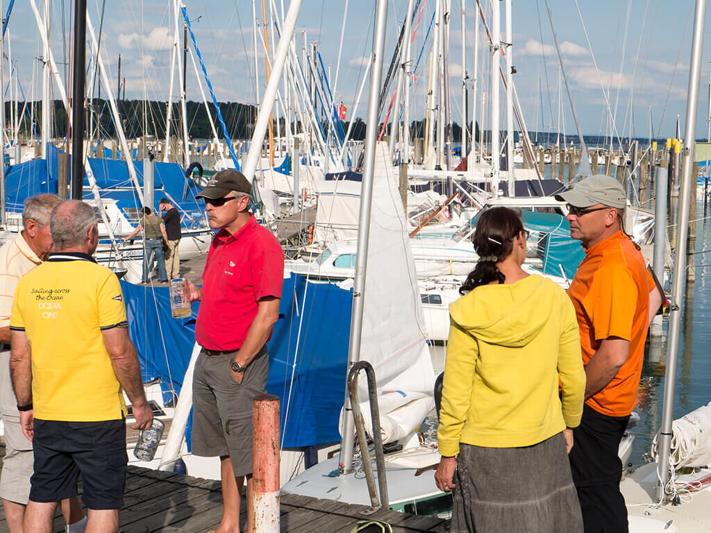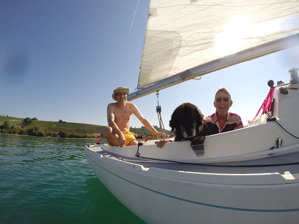 Am Sonntag sind so viele Boote auf der Kieler Förde unterwegs, dass man beinahe mit trockenen Füßen von Ufer zu Ufer übersteigen kann. Und so war mit Freds vollem Einverständnis Sonntag Hafentag. Wir verbrachten ihn unter strahlender Sonne mit Faulenzen. Fred am Steg und ich im Cockpit. Beim Mittagsspaziergang fragte mich ein älteres Ehepaar: „Was ist das für eine Rasse?“ „Ja“, sagte ich mit einem Lächeln, „das ist ein seltener Ägyptischer Schlittenhund.“ „So einen habe ich auch gehabt!“ kam prompt als Antwort und wir alle haben gelacht. Als Engländer mit 30 Jahren pfälzischer Gemütlichkeit auf dem Buckel, war ich freudig überrascht auch an der Deutschen Ostseeküste nette und aufgeschlossene Leute getroffen zu haben.
