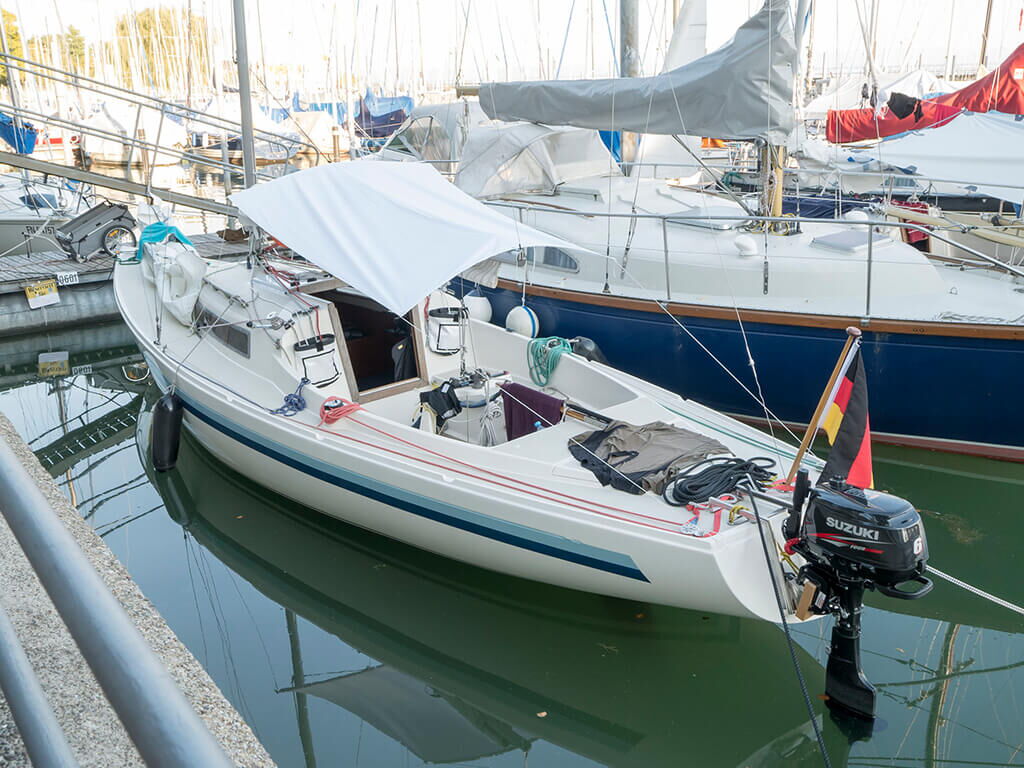 Am nächsten Morgen habe ich den Rest des Gepäcks ins Boot geladen, Auto und Trailer bei Jan Sails im Hof geparkt, Cockpitzelt vermessen und besprochen und jetzt endlich: