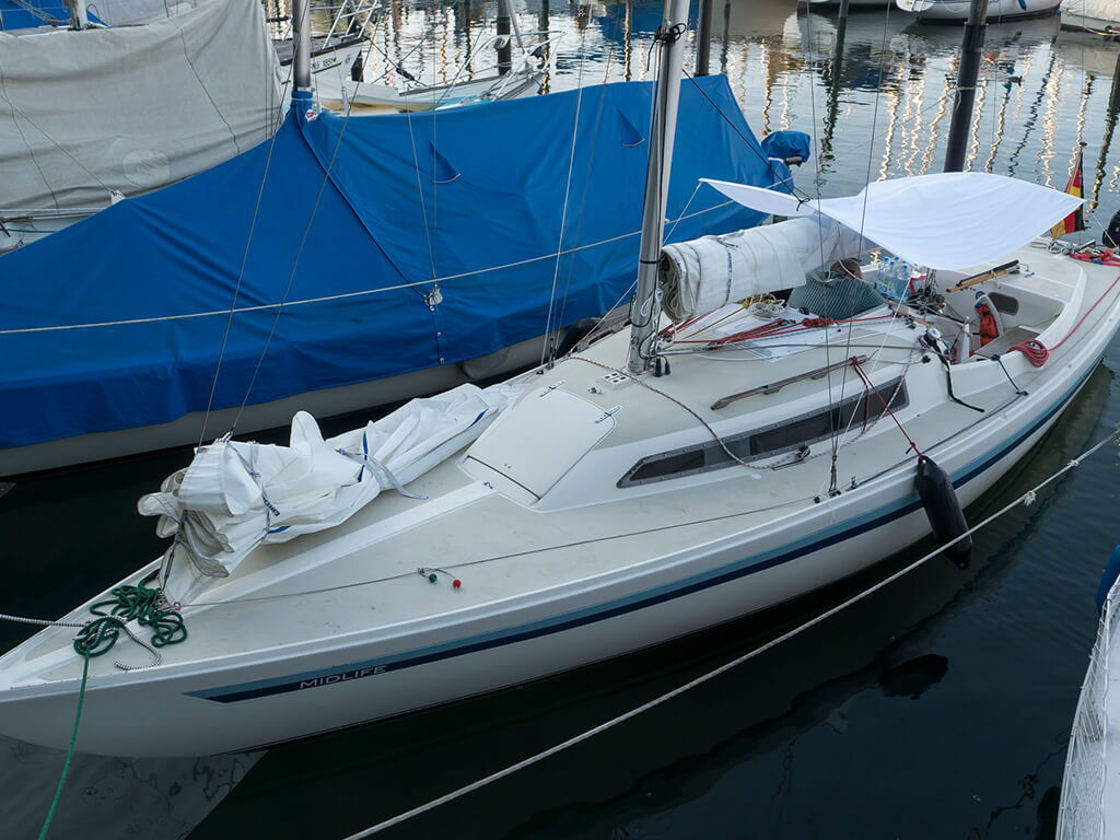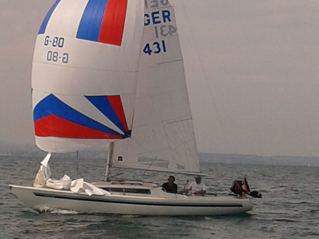 Sonst war der letzte Segeltag – wie all die anderen – einfach klasse! Der Wind kam wieder aus Westen mit 3 – 4 Bft, Sonne. Drei andere Boote als Begleitung. Unter der Fehmarnsundbrücke kam der Wind direkt von achtern. Was ich hasse! Aber bei Tonnenpaar 15/16 war Halbwind angesagt und dann ging die Post ab! Dieses Gefühl kennt ihr alle. Für mich als H-Boot-Neuling ist es so: ich kann nicht aufhören, zu grinsen. An der Einfahrt zum Großenbroder Binnensee fiel der Wind sehr hoch ein, gerade noch zu schaffen. Und mit etwas Geschick bin ich bis unter den Kran der Molawerft gefahren, was nicht unbemerkt blieb. Von den Anwesenden war zu hören: „Das ist immer noch ein verdammt gutes Boot!“. Leider war damit um 13:00 Uhr mein H-Boot-Segeljahr zu Ende. Mit freundlicher Hilfe der Werft war abends ausgekrant und das Gespann abfahrbereit. Aber mit einem Stroman-schluss am Parkplatz bin ich noch einen Abend an Bord geblieben.