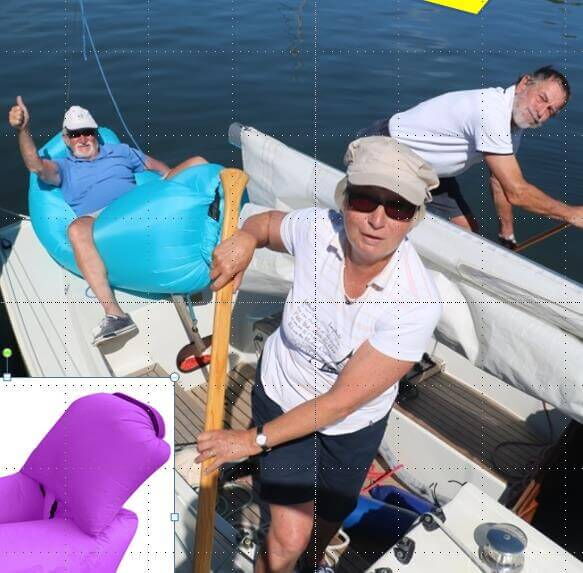 Die folgenden Informationsbeiträge wurden wie immer mit witzigen Bildern und wahren oder auch erfundenen Geschichten über die verschiedene H-Boot-ler garniert. Hatte Christoph schon vom Start weg mit den im Hintergrund laufenden satirisch, witzig kommentierten Regattabildern für Heiterkeit gesorgt, ging es jetzt mit weiteren satirischen Beiträgen weiter. So übernehmen die H-Boote zwei Entwicklungen aus dem Americas Cup. Zum einen werden gerade die ersten H Boote mit Radelplätzen ähnlich der Neuseeländer ausgestattet. Zum Zweiten werden die Orientierungslinien, wie z.B. die Startlinie und die laylines die das Americascup Gucken so reizvoll machten, nun bei H-Boot Regatten auch im Wasser angebracht, um den regattierenden H-Booten die Orientierung zu erleichtern.