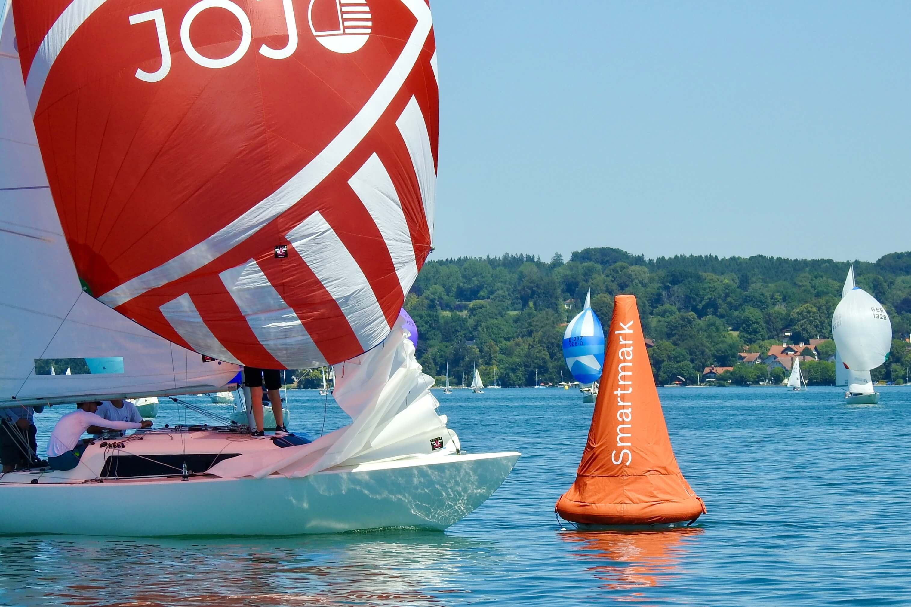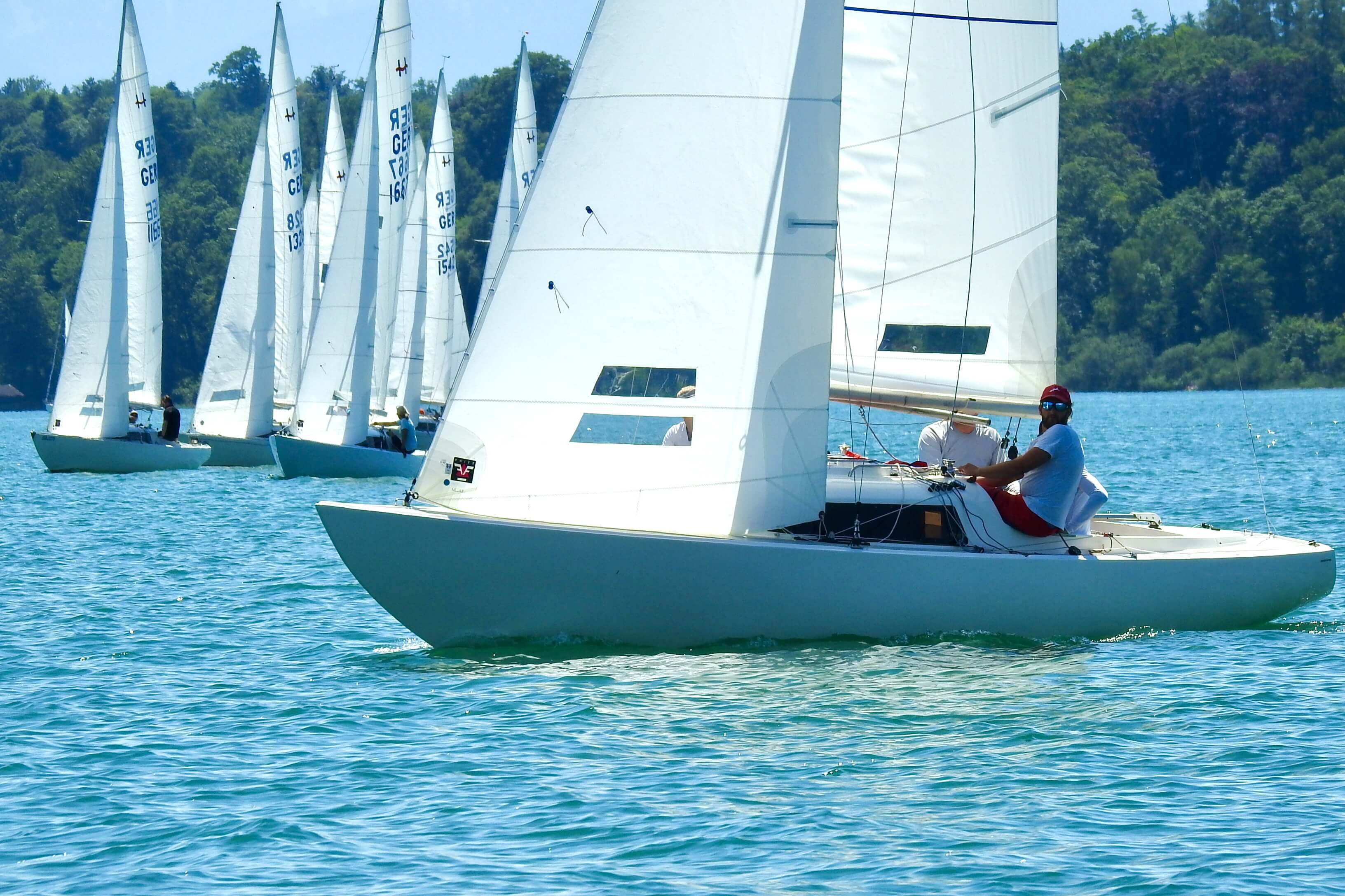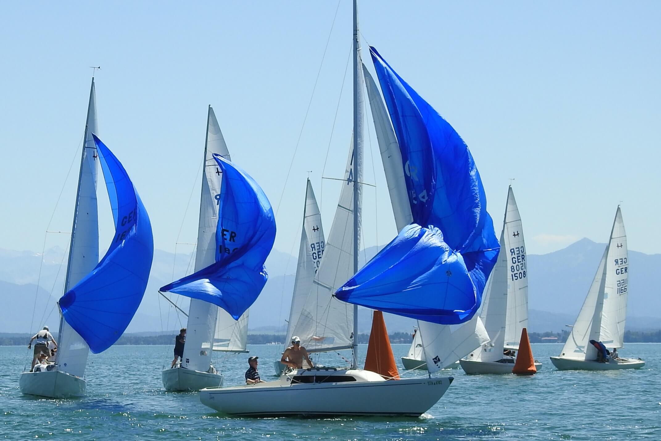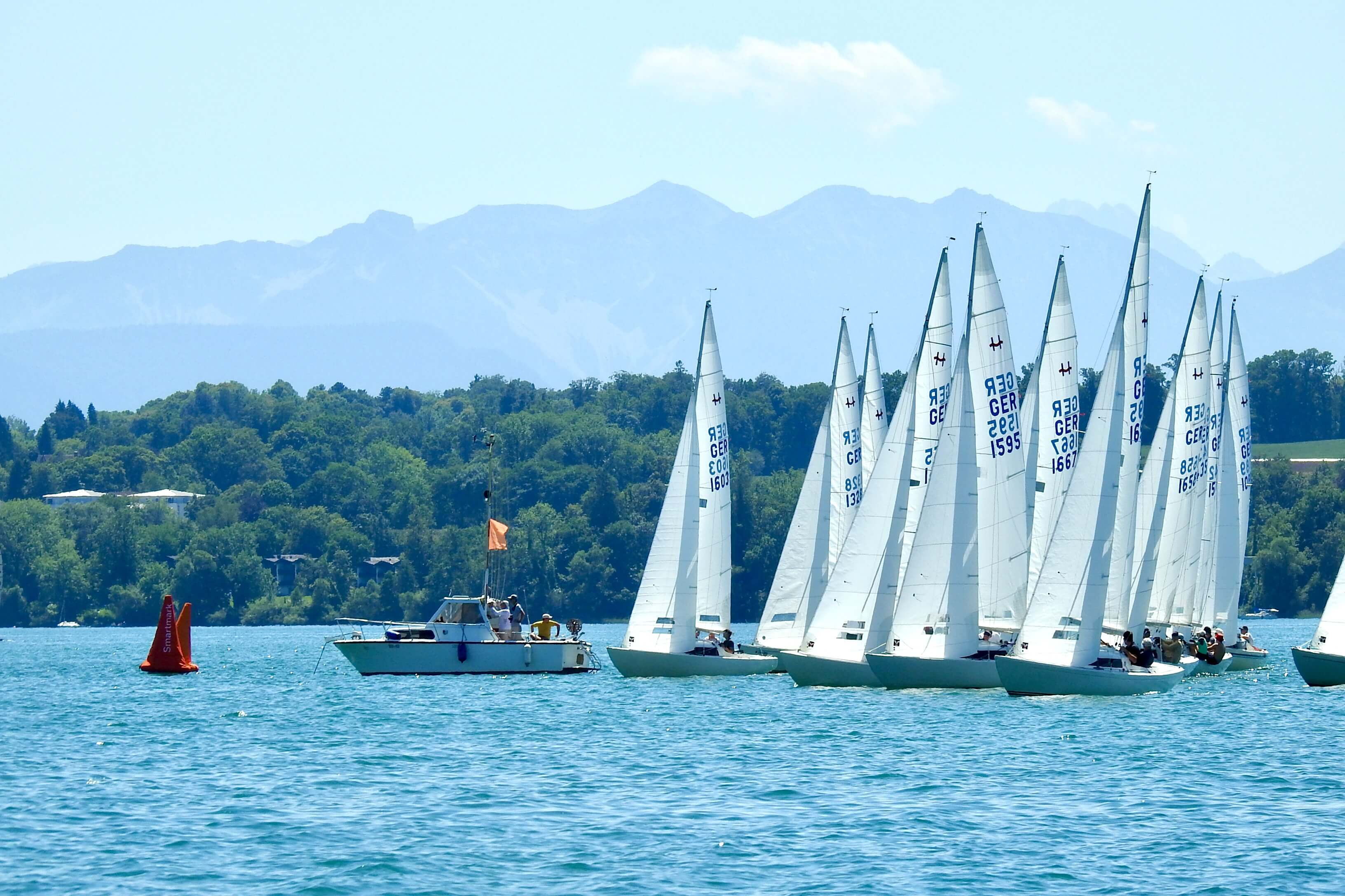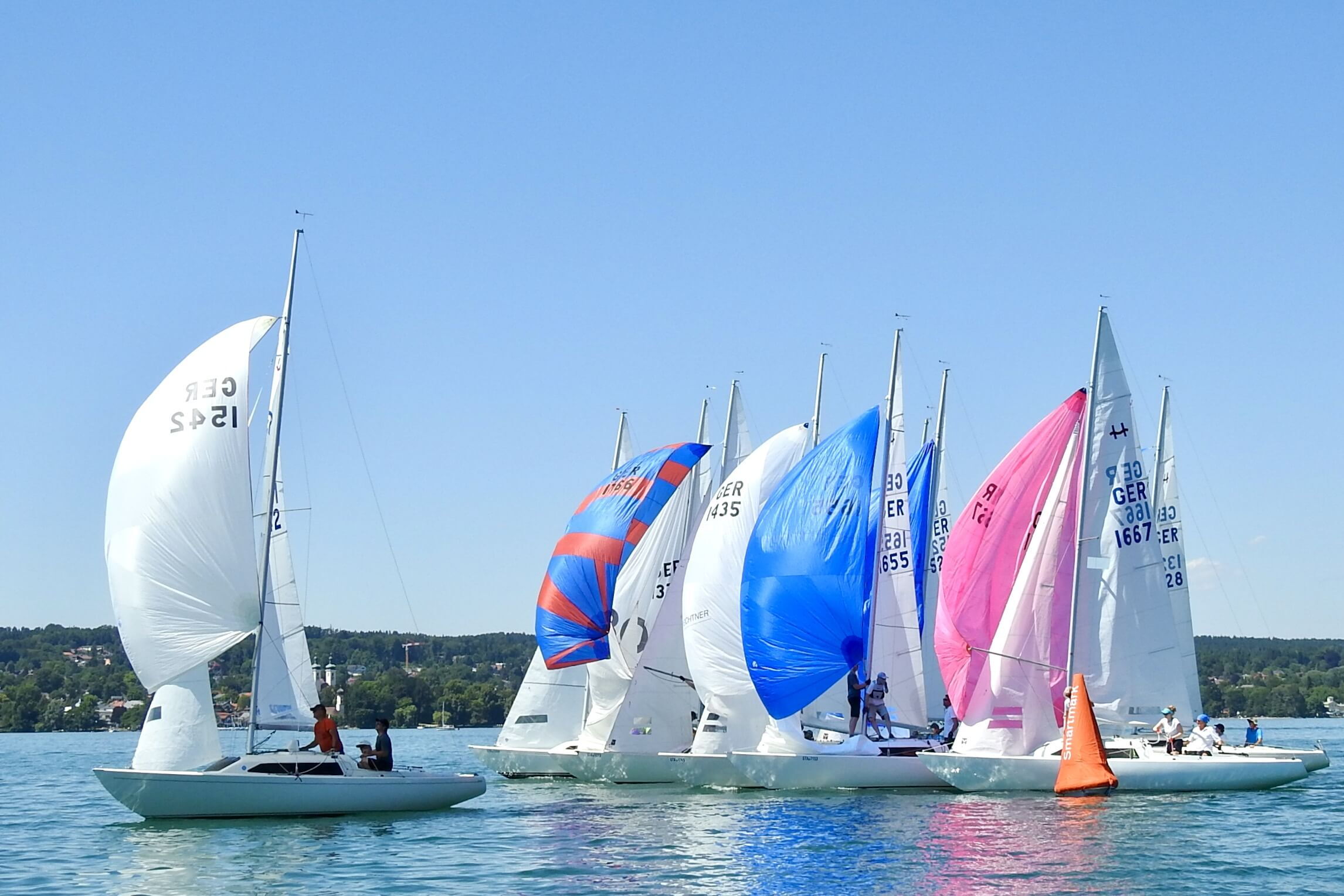 Im Windfinder waren bis zu 9 kn Wind aus Ost zu sehen, allerdings abnehmend auf 6 kn zwischen 13:00 und 15:00 Uhr. Tatsächlich baute sich ab 13:00 Uhr Wind aus Ost auf und Wettfahrtleiter Michael Lohner schickte sowohl die orangen Smartmarks als auch die H-Boot Seglerinnen und Segler aufs Wasser. Flugs war ein Kurs gegen 95° gelegt, und auch der 1. Start klappe auf Anhieb, was auch an der Flagge „U“ gelegen haben mag. Beinahe im Startverfahren drehte der Wind nach links und wurde etwas schwächer. Viele Dreher und Löcher machten den Seglern das Leben schwer, dazu kam die immer noch herrschende Hitze. Auf dem 2. Vorwindkurs schob sich das Feld unter Spinnaker extrem zusammen und mühte sich um die linke Torbahnmarke. Der Wind ließ dann immer mehr nach, und Boote am Ende des Feldes konnten im Vorbeifahren in Ruhe das Drehen der SmartMark-Propeller beobachten. Die GER 1658 des Schreibers dieser Zeilen schaffte gerade noch das Zeitlimit, die 3 Boote hinter ihm leider nicht mehr. Gar nicht mitsegeln konnte ein Boot, das Probleme mit seinem Großfall hatte. Die 1. Wettfahrt gewann Andi Lachenschmid vom MYC vor Matthias Zach/BYC und Otto Hartmann/MYC.