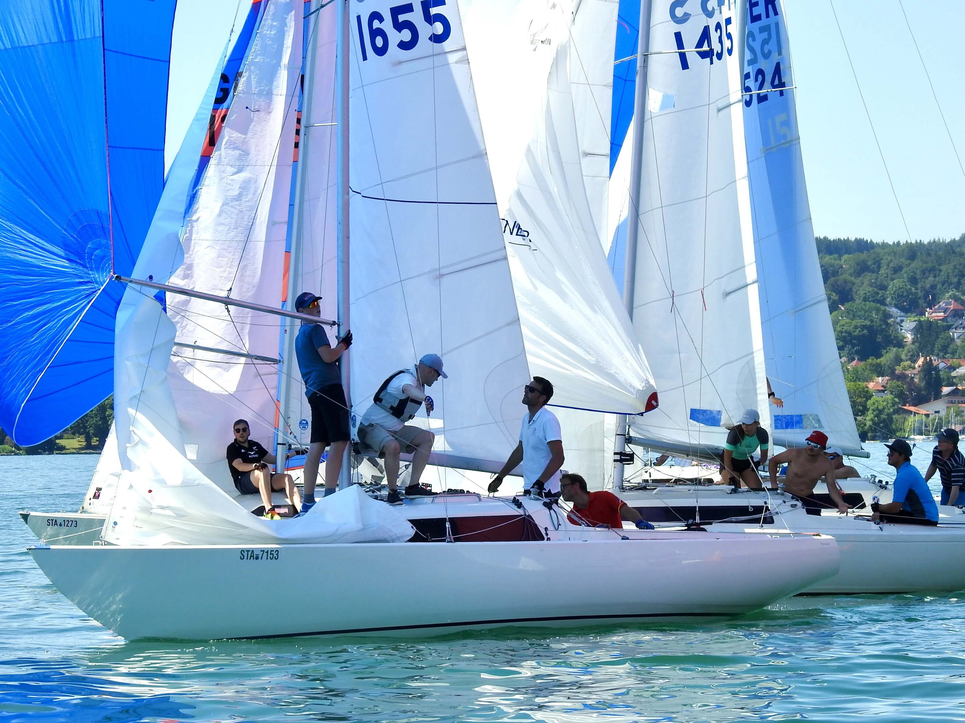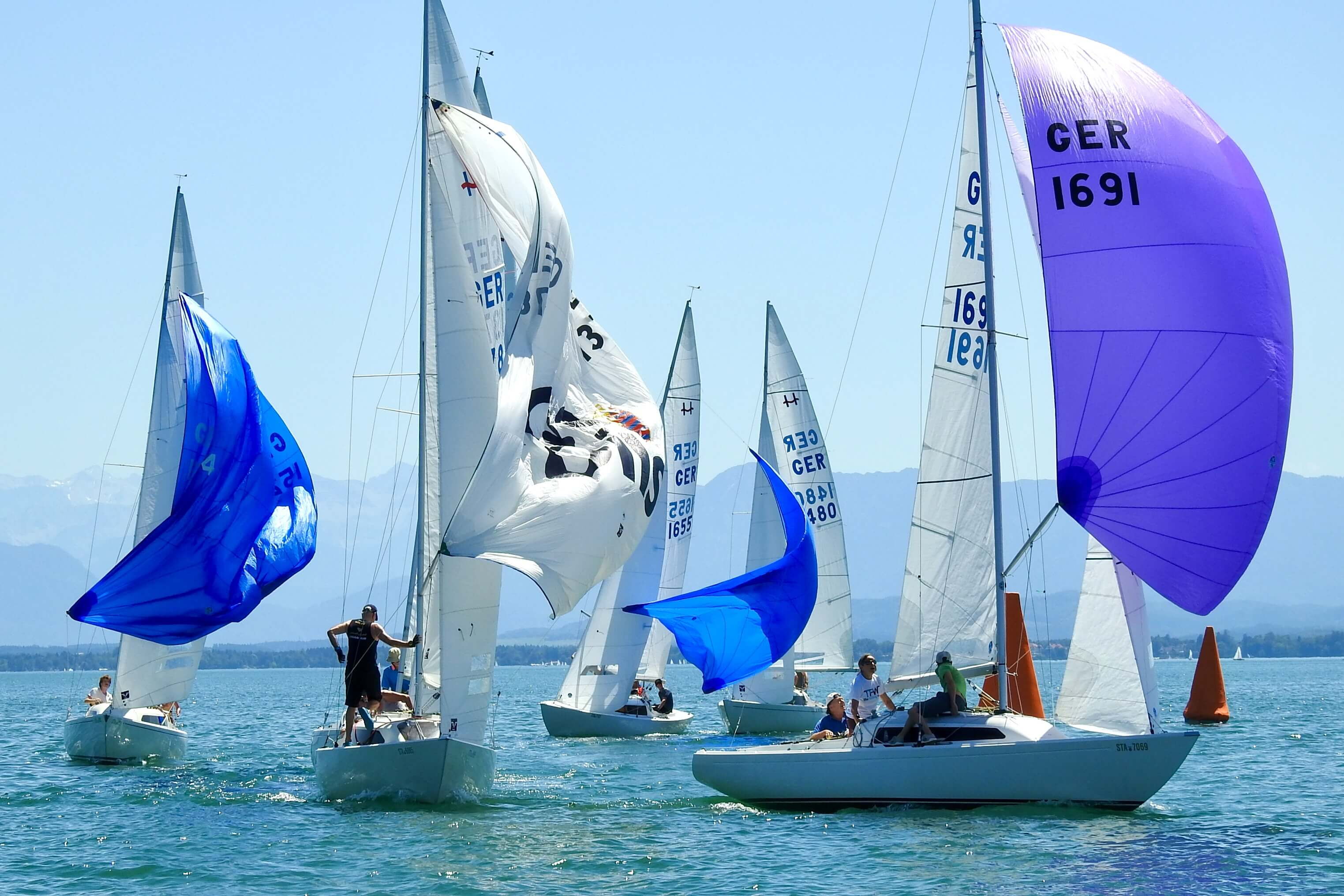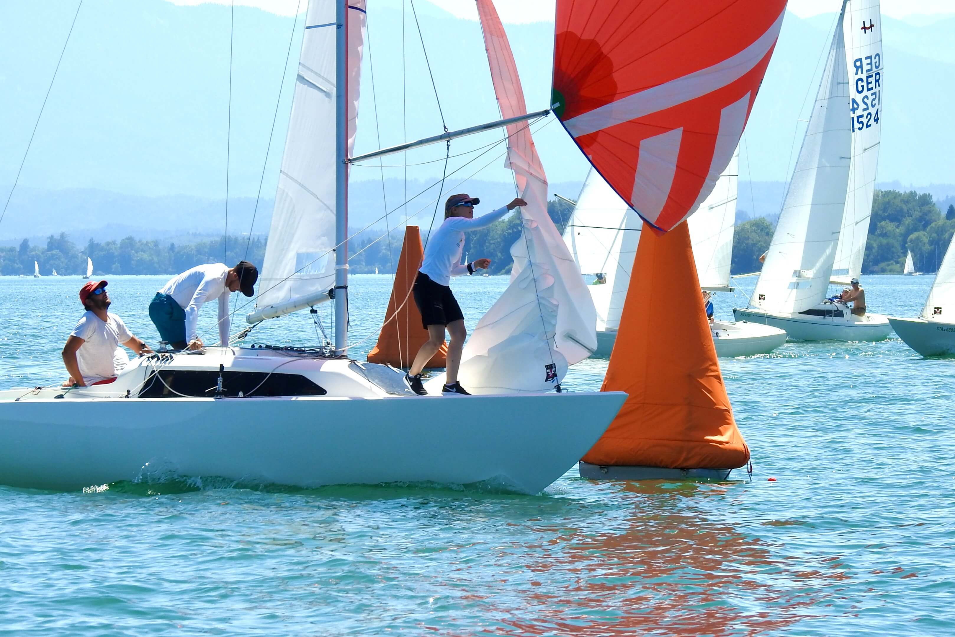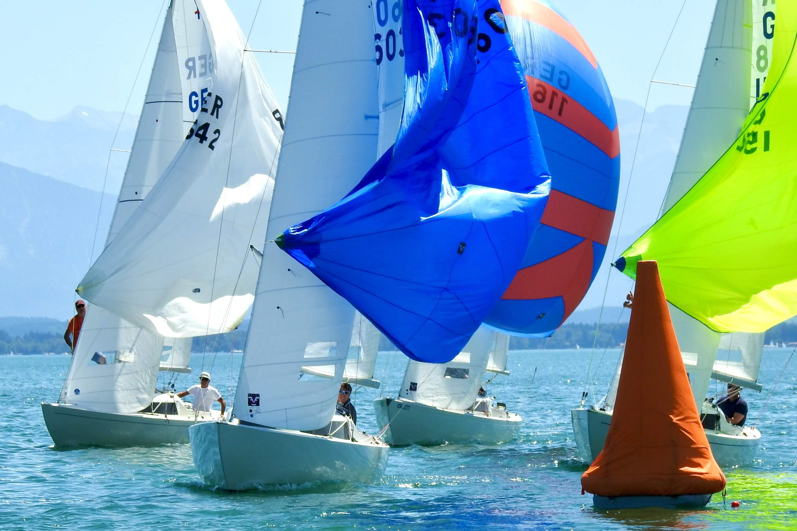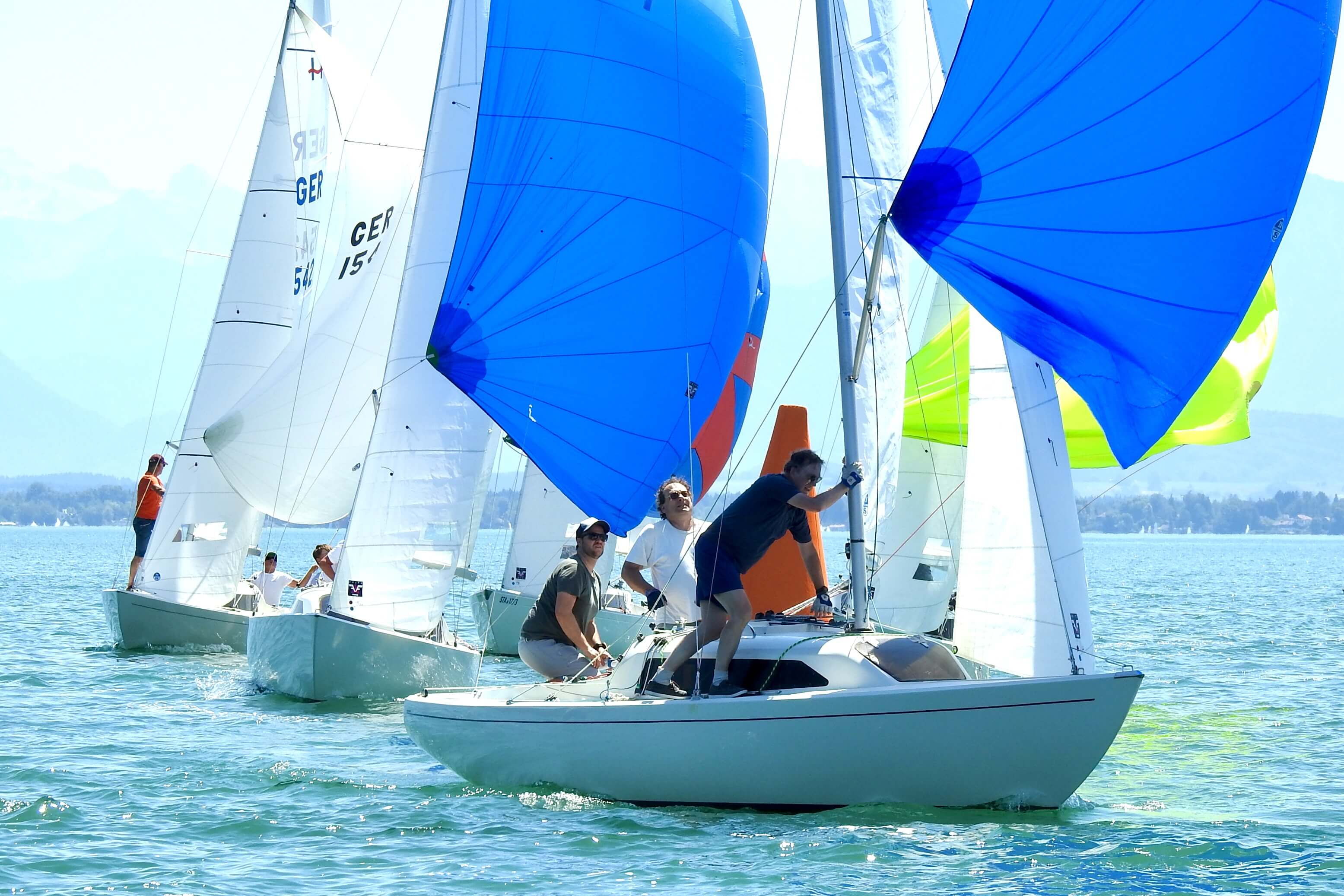 Im Windfinder waren bis zu 9 kn Wind aus Ost zu sehen, allerdings abnehmend auf 6 kn zwischen 13:00 und 15:00 Uhr. Tatsächlich baute sich ab 13:00 Uhr Wind aus Ost auf und Wettfahrtleiter Michael Lohner schickte sowohl die orangen Smartmarks als auch die H-Boot Seglerinnen und Segler aufs Wasser. Flugs war ein Kurs gegen 95° gelegt, und auch der 1. Start klappe auf Anhieb, was auch an der Flagge „U“ gelegen haben mag. Beinahe im Startverfahren drehte der Wind nach links und wurde etwas schwächer. Viele Dreher und Löcher machten den Seglern das Leben schwer, dazu kam die immer noch herrschende Hitze. Auf dem 2. Vorwindkurs schob sich das Feld unter Spinnaker extrem zusammen und mühte sich um die linke Torbahnmarke. Der Wind ließ dann immer mehr nach, und Boote am Ende des Feldes konnten im Vorbeifahren in Ruhe das Drehen der SmartMark-Propeller beobachten. Die GER 1658 des Schreibers dieser Zeilen schaffte gerade noch das Zeitlimit, die 3 Boote hinter ihm leider nicht mehr. Gar nicht mitsegeln konnte ein Boot, das Probleme mit seinem Großfall hatte. Die 1. Wettfahrt gewann Andi Lachenschmid vom MYC vor Matthias Zach/BYC und Otto Hartmann/MYC.