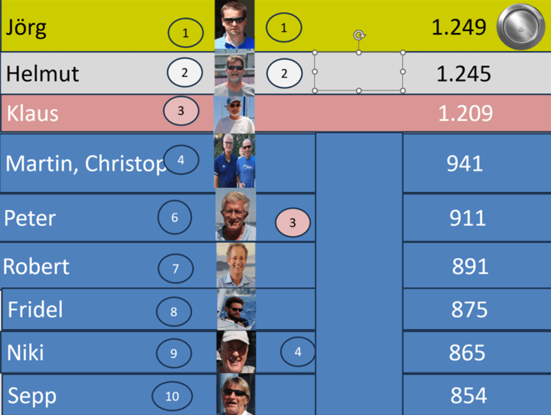 Ab diesem Jahr wird in der Ammersee-Flottenmeisterschaft nicht mehr die beste Steuerfrau oder der beste Steuermann geehrt, sondern die beste Seglerin oder der beste Segler, unabhängig von ihrer Funktion an Bord. 37 Ammersee-Boote und 82 Seglerinnen und Segler schafften es in die Rangliste der H-Boot-Familie am Ammersee – ein denkbar knappes Ergebnis: Der Sieger sammelte 1.249 Punkte, der Zweitplatzierte 1.245 und der Drittplatzierte 1.209 Punkte. Der neue Flottenmeister des Ammersees für 2024 wurde verdientermaßen Jörg Bleiholder vom DSC, der schon seit vielen Jahren stets Plätze zwischen zwei und vier belegte. Den zweiten Platz sicherte sich Helmut Settele vom HSC vor Klaus Richter, dem Vorschoter von Jörg und ebenfalls Mitglied des HSC.