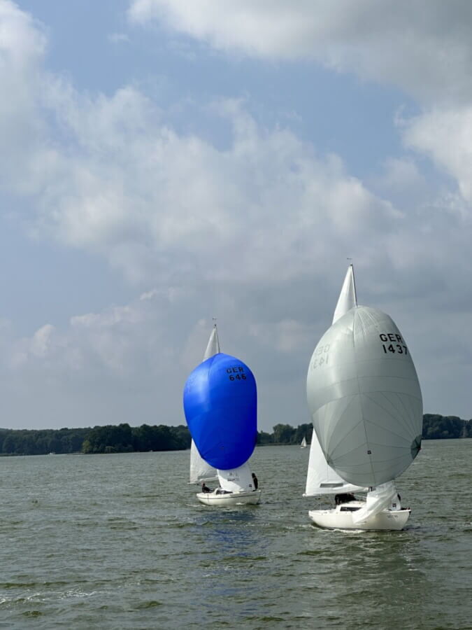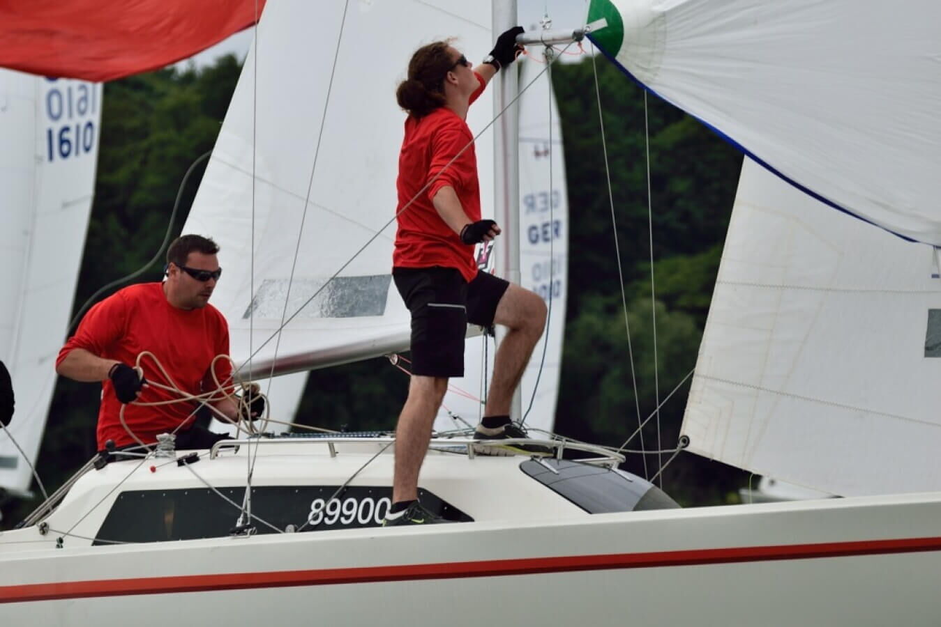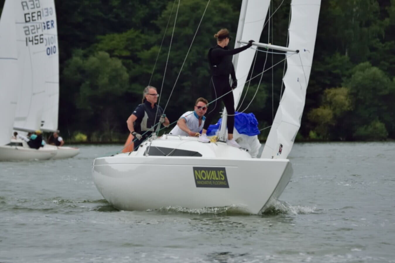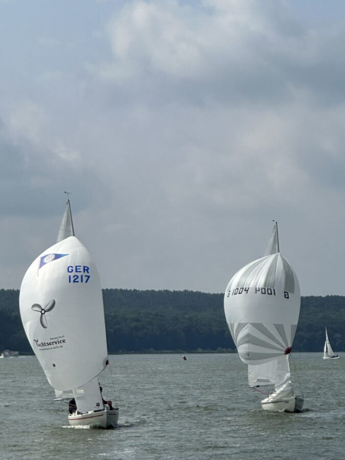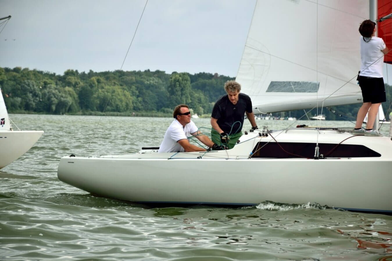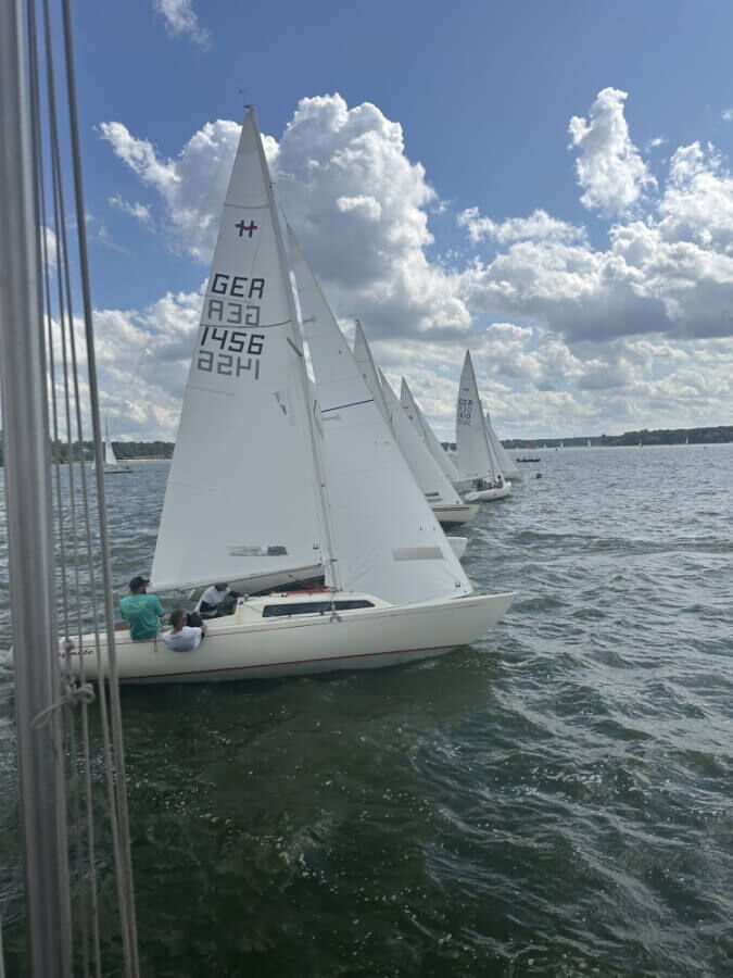 Am Samstag fanden insgesamt vier Wettfahrten bei gemütlichen 2 bis 3,5 Windstärken statt. Der Wind wehte aus Südwest mit einer doch recht bevorteilten rechten Seite, die wir aber im ersten Rennen nicht nutzten. Gewinner des ersten Laufes war Thomas Kausen mit Thomas Drtina und Theresa Böttger gefolgt von Holger und Jan Köhne mit Sven Ulrich, die dann auch das zweite Rennen gewannen.