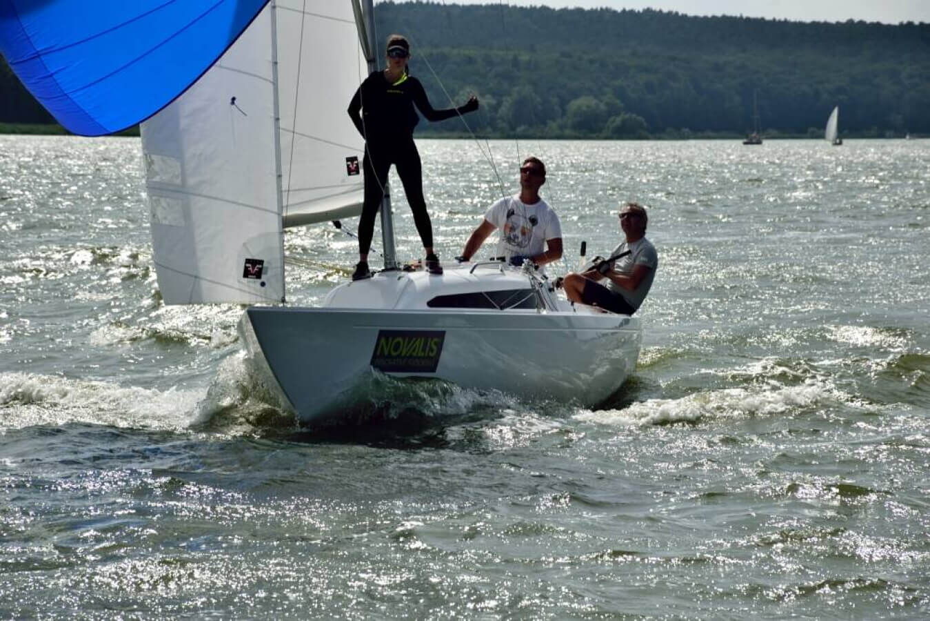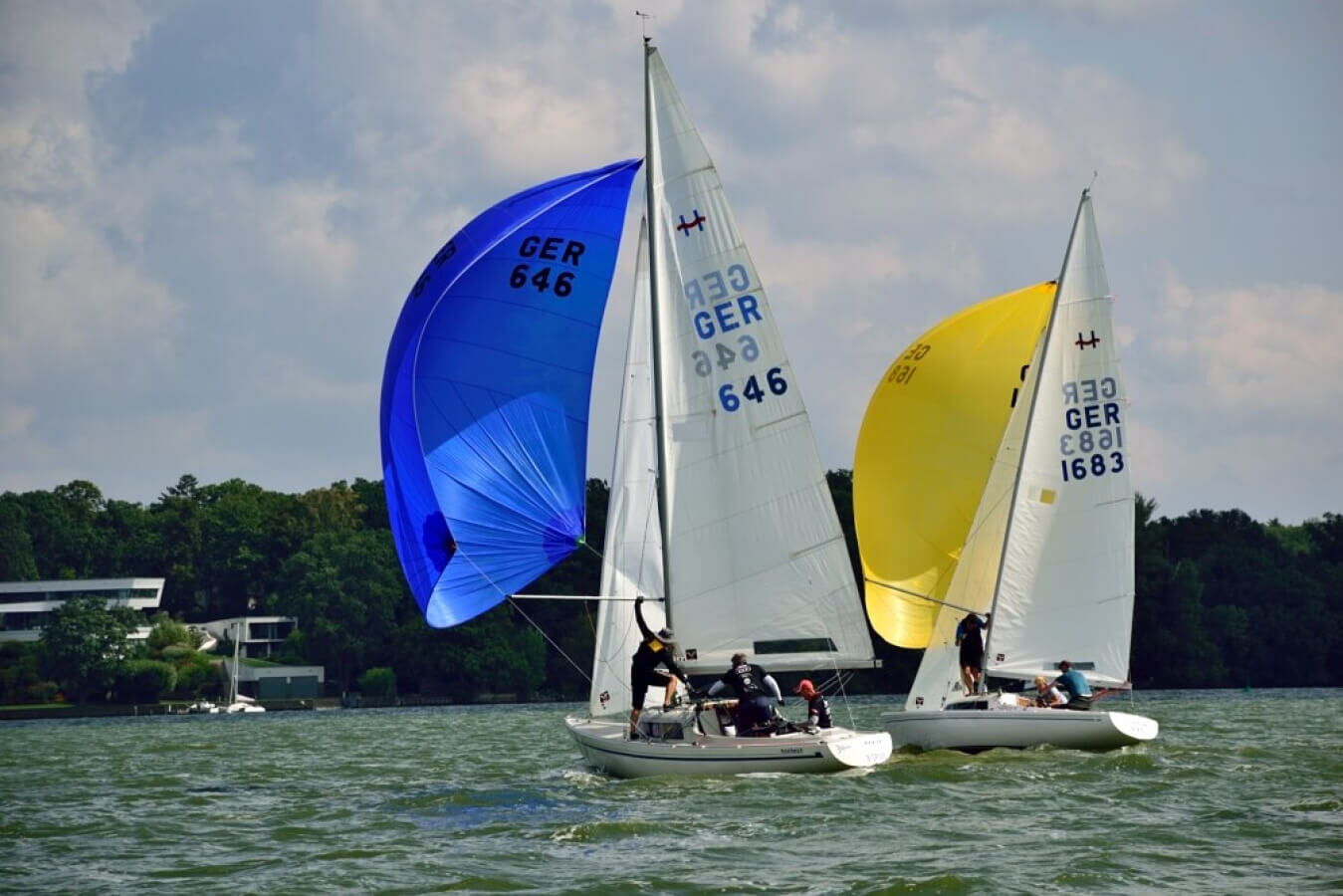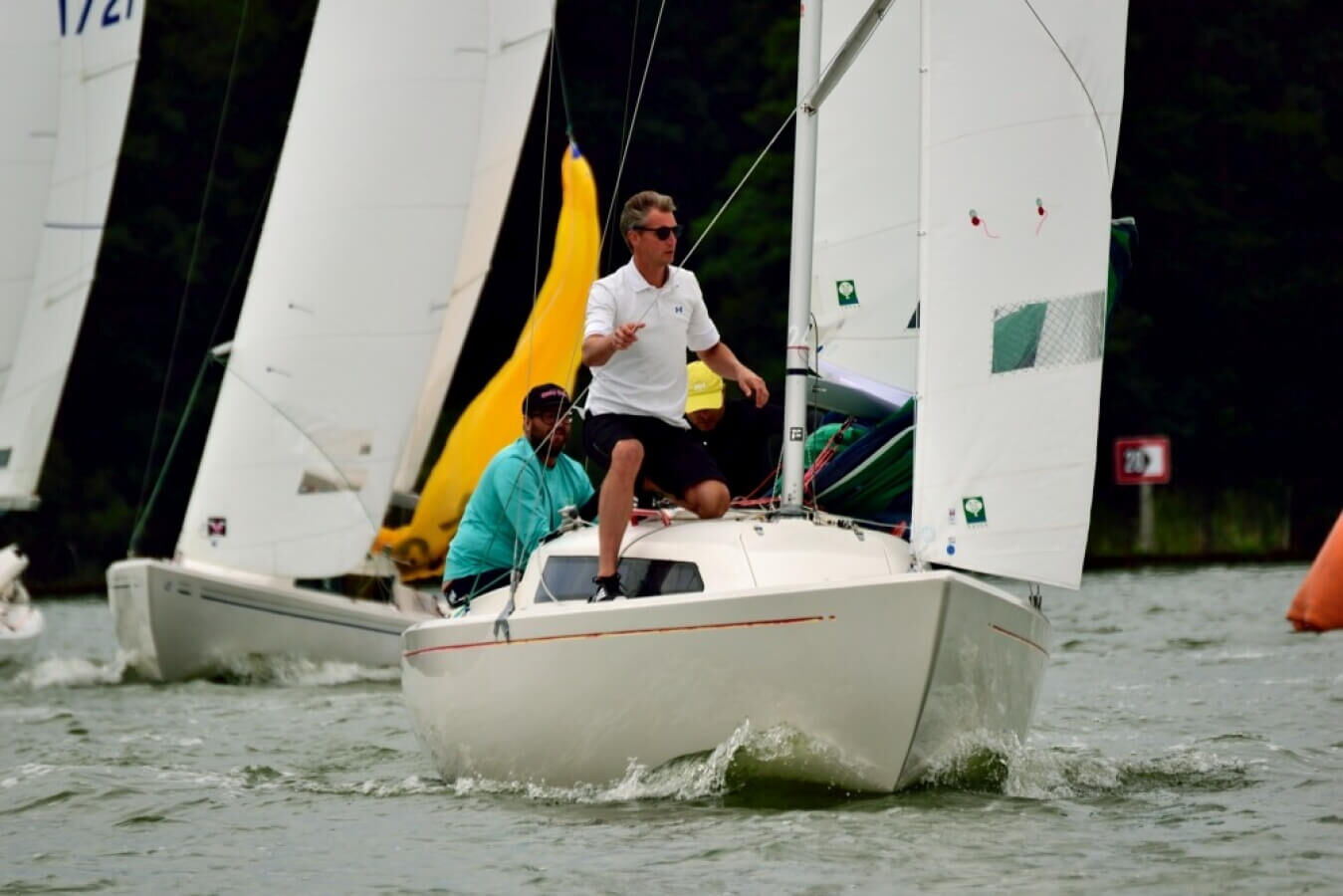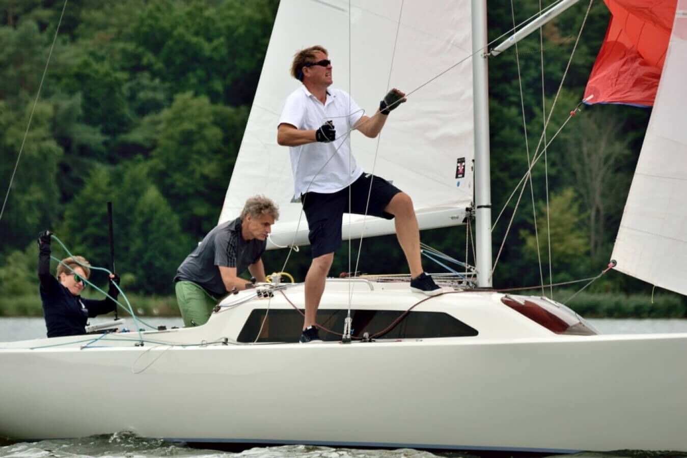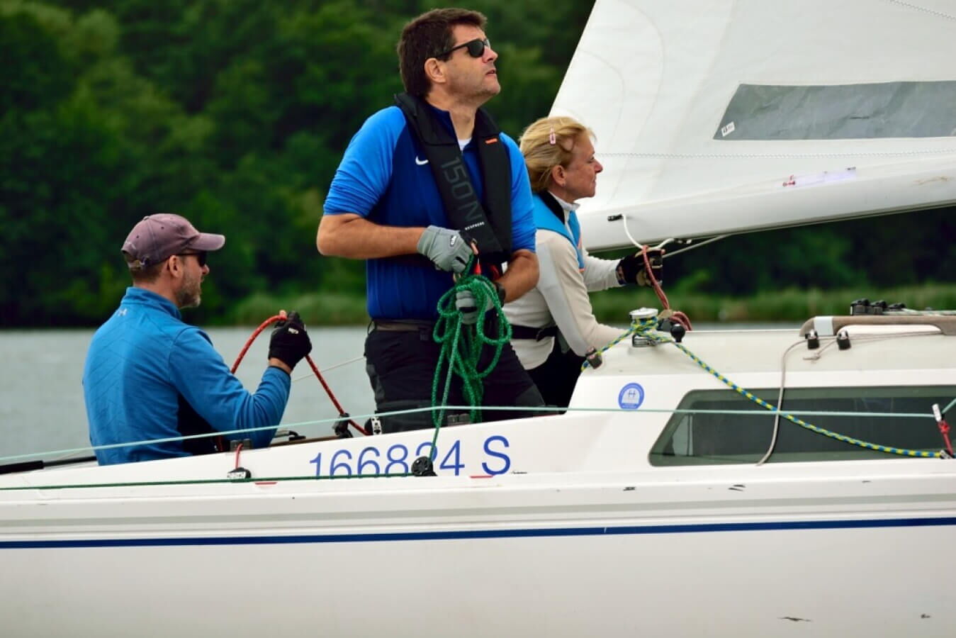 Am Samstag fanden insgesamt vier Wettfahrten bei gemütlichen 2 bis 3,5 Windstärken statt. Der Wind wehte aus Südwest mit einer doch recht bevorteilten rechten Seite, die wir aber im ersten Rennen nicht nutzten. Gewinner des ersten Laufes war Thomas Kausen mit Thomas Drtina und Theresa Böttger gefolgt von Holger und Jan Köhne mit Sven Ulrich, die dann auch das zweite Rennen gewannen.