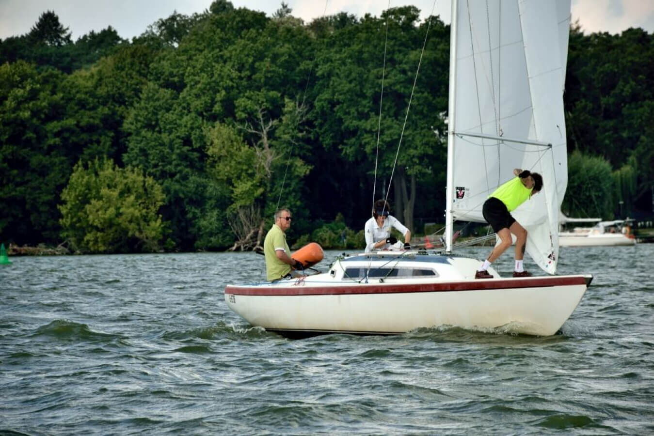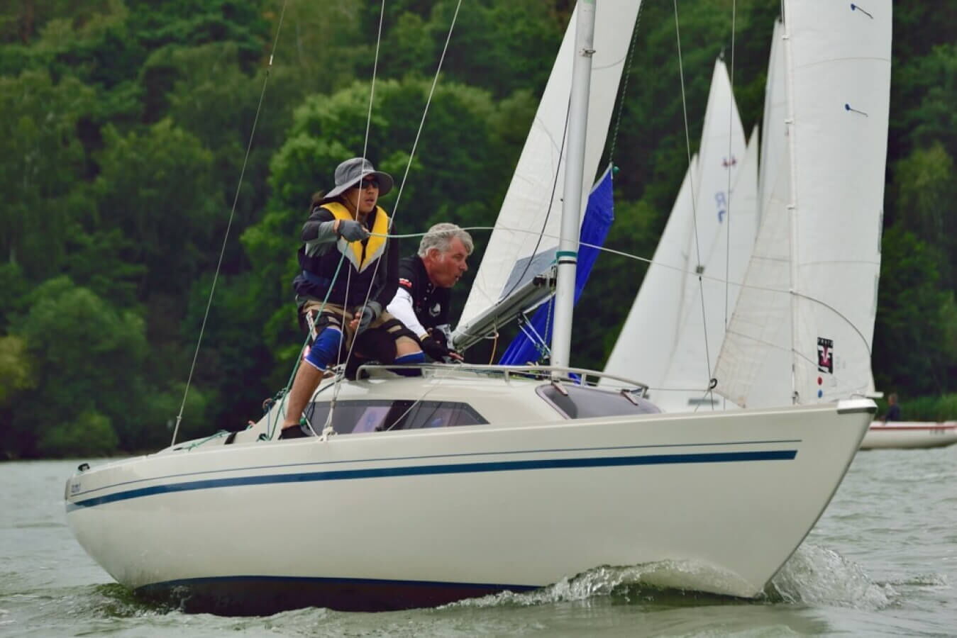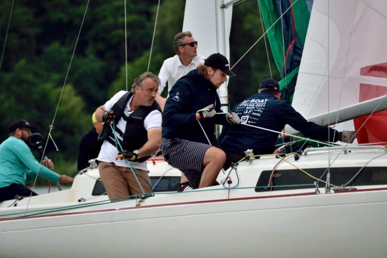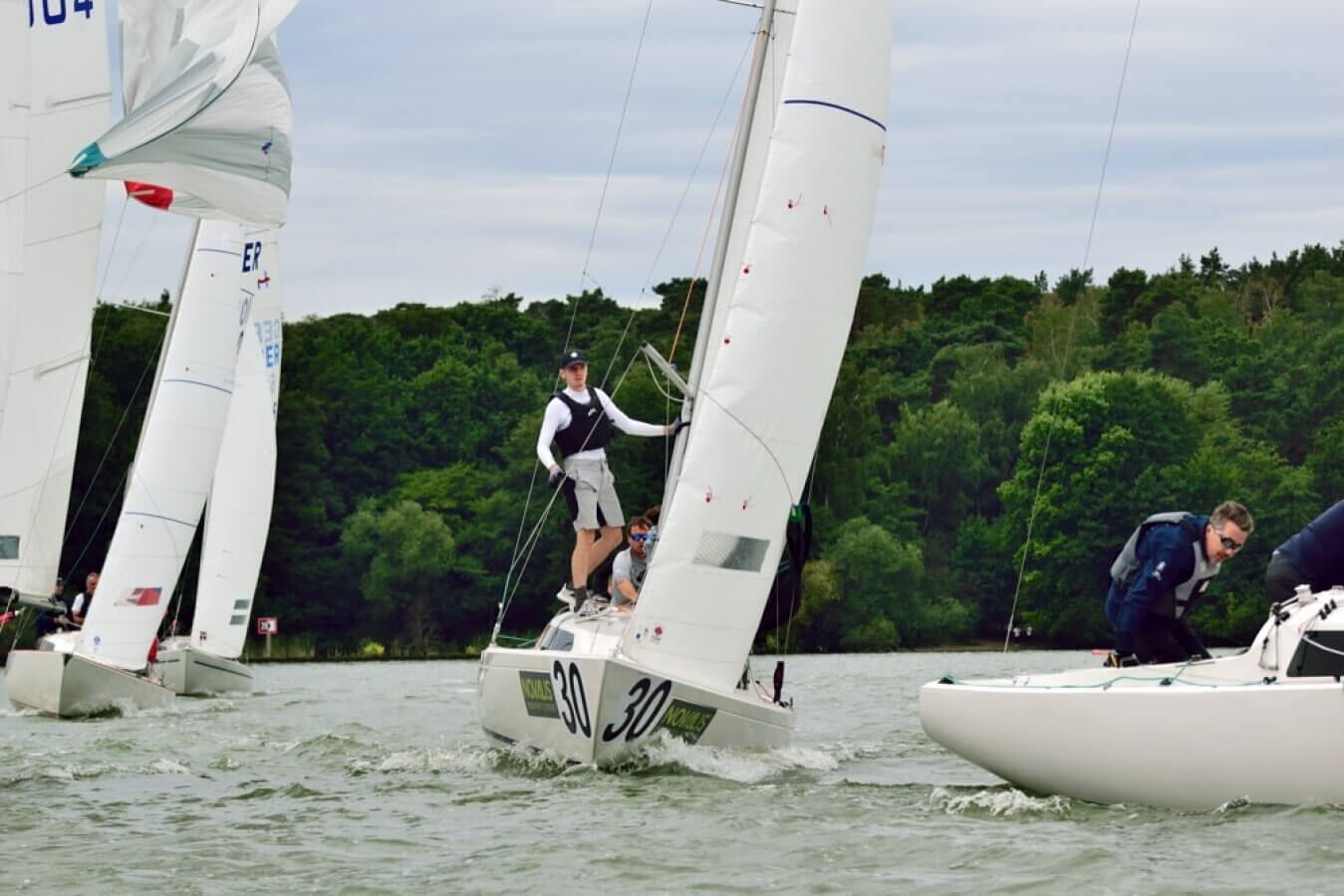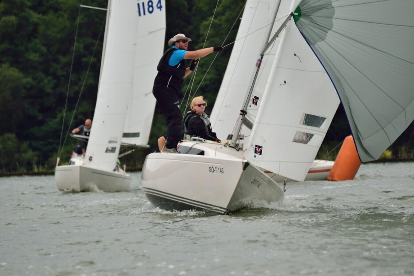 Am Samstag fanden insgesamt vier Wettfahrten bei gemütlichen 2 bis 3,5 Windstärken statt. Der Wind wehte aus Südwest mit einer doch recht bevorteilten rechten Seite, die wir aber im ersten Rennen nicht nutzten. Gewinner des ersten Laufes war Thomas Kausen mit Thomas Drtina und Theresa Böttger gefolgt von Holger und Jan Köhne mit Sven Ulrich, die dann auch das zweite Rennen gewannen.